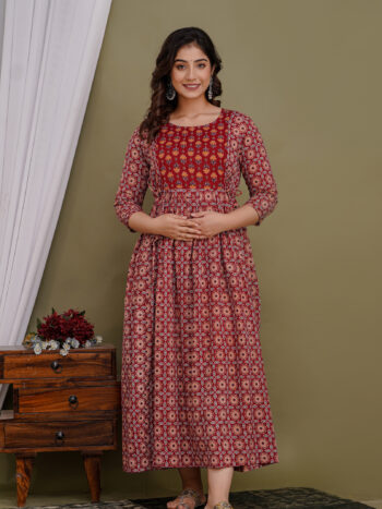 Sale 100%Ashvy Premium Cotton Anarkali Maternity & Feeding Kurti for Women – 48 Inch Length, 2 Side Zips, Comfortable Nursing Wear for Moms (Maroon)