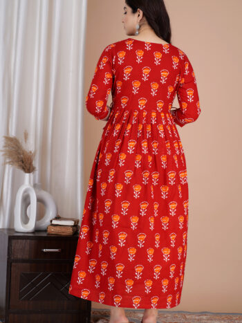 Sale 100%Ashvy Red Floral Cotton Feeding & Maternity Kurti – Elegant Anarkali Design with Hidden Zips for Nursing Moms