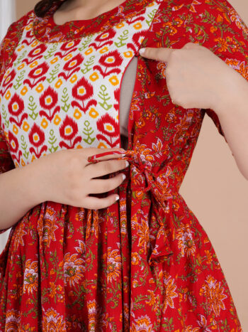Sale 100%Ashvy Red Floral Cotton Feeding & Maternity Kurti – Elegant Anarkali Design with Hidden Zips for Nursing Moms
