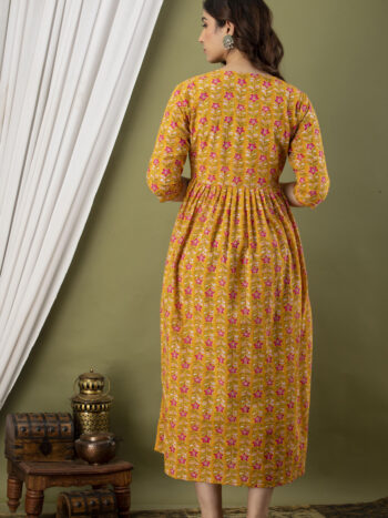 Sale 100%Ashvy Mustard Floral Maternity Kurti – Pure Cotton Feeding Gown with Broad Flower Print for Nursing Moms