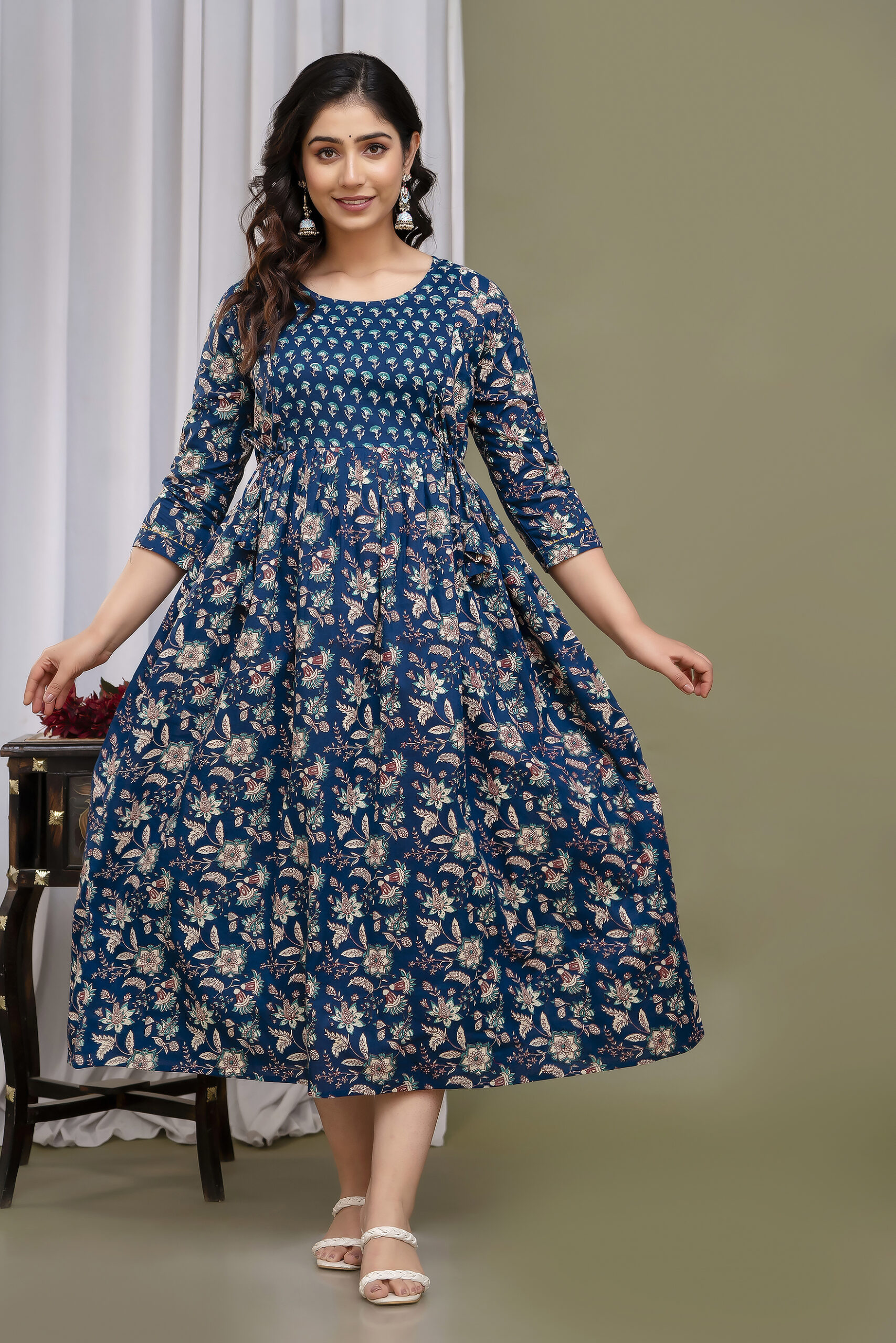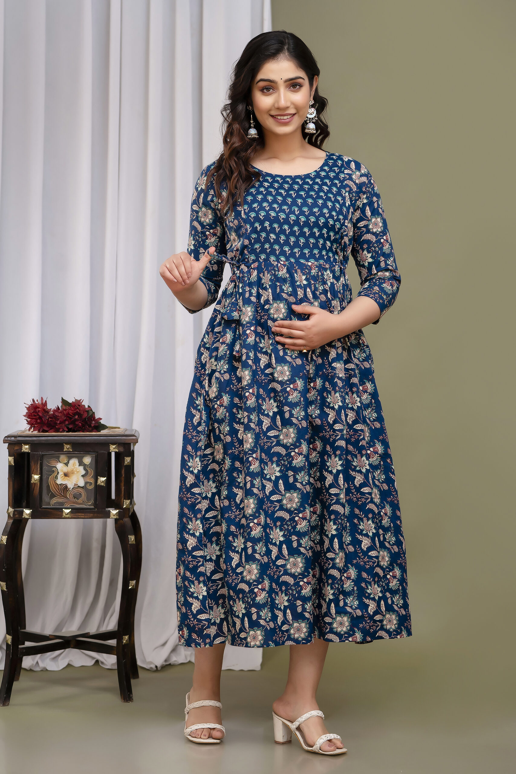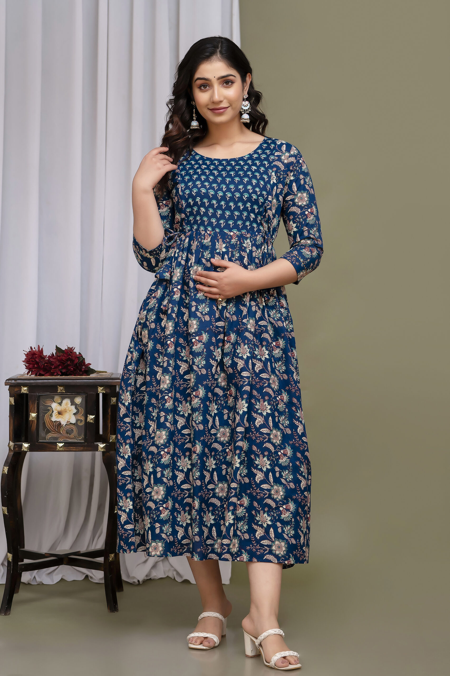The Anarkali-style design with graceful pleats enhances your natural shape while offering a comfortable, flattering fit. Thoughtfully designed two hidden side zips make feeding easy and discreet, combining functionality with timeless floral beauty.