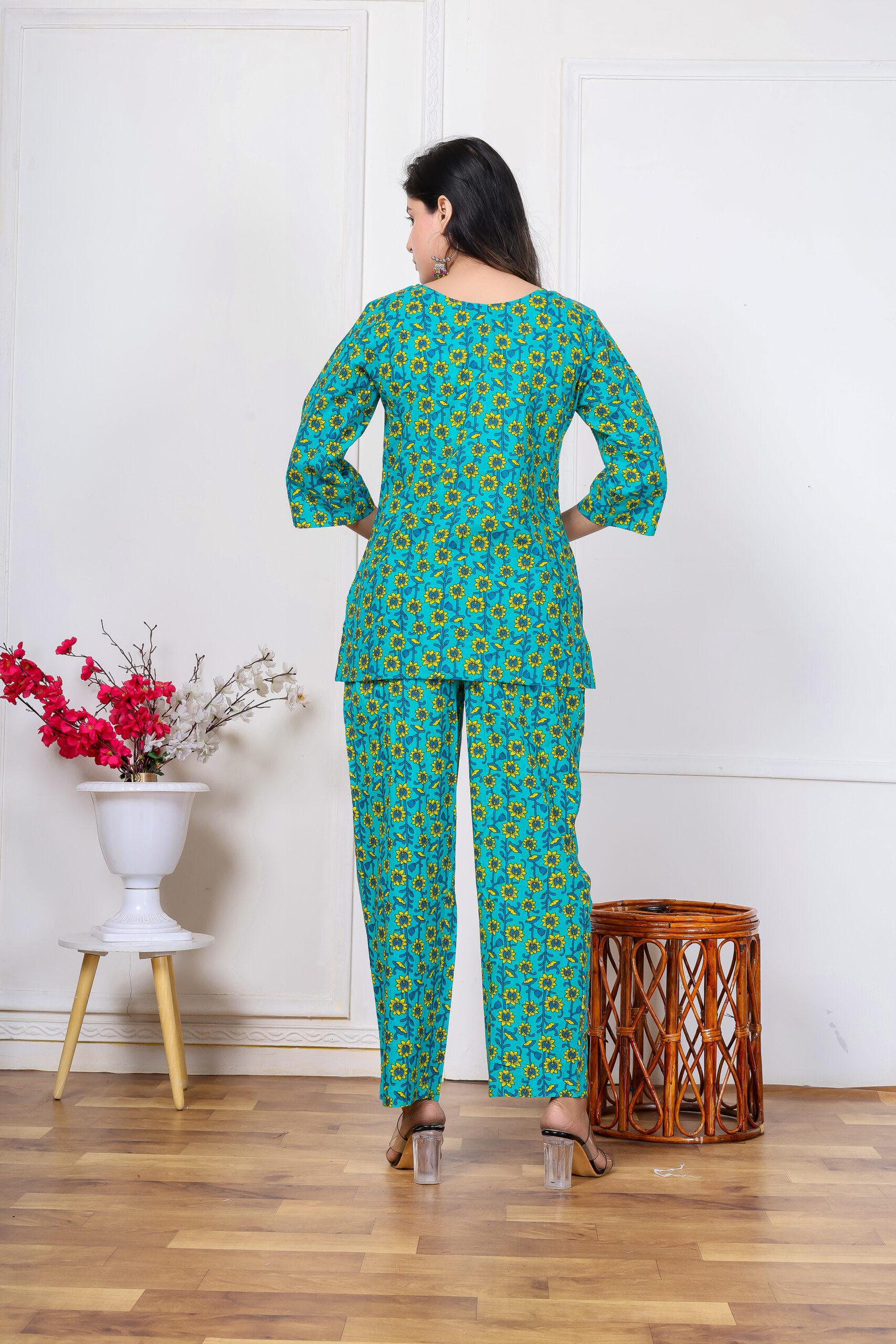 A soft and breathable pure cotton sky blue co-ord set featuring a stylish printed top and matching pant—perfect for office, outings, travel, and everyday elegance.