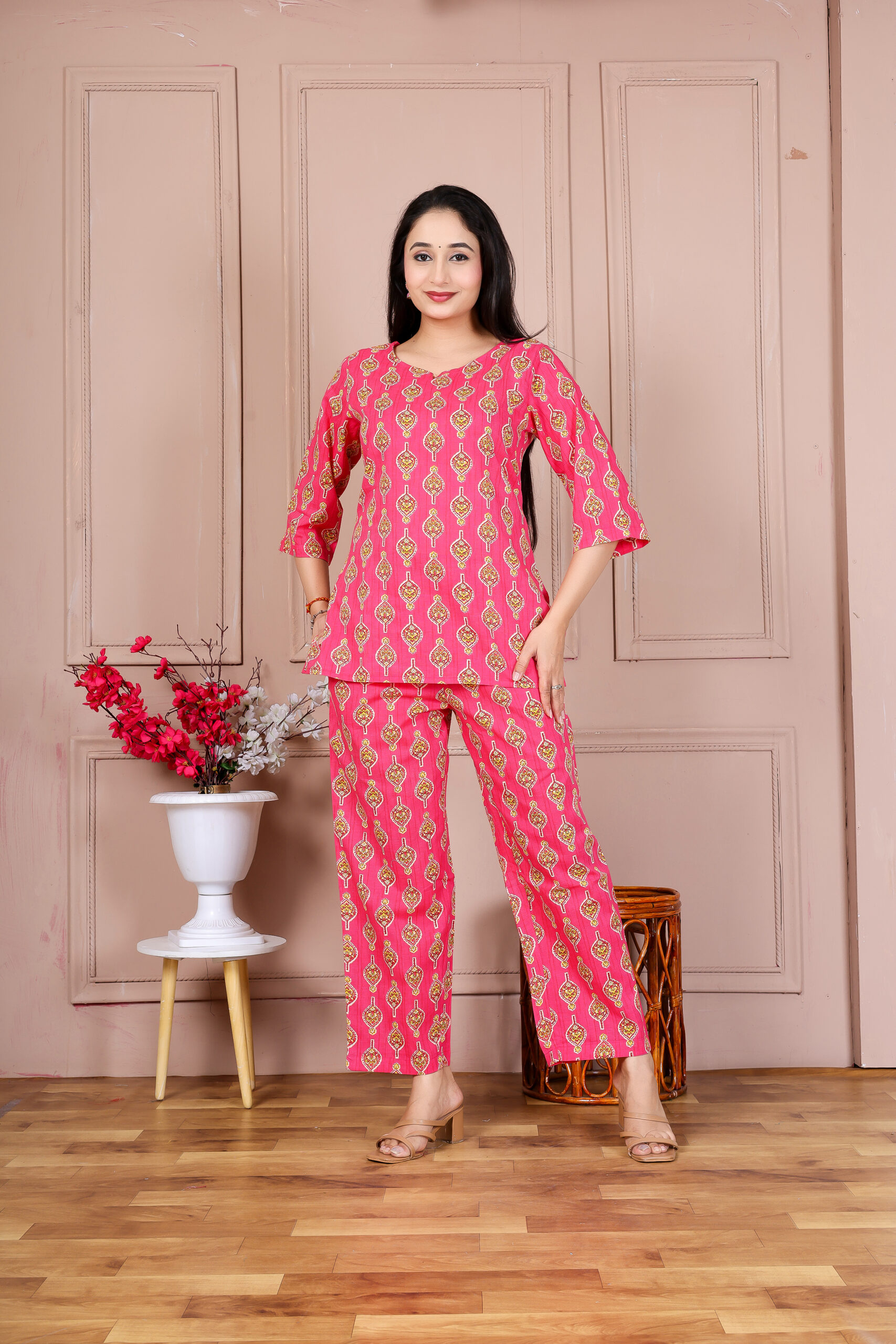 Vibrant Bright Pink pure cotton co-ord set featuring a soft 3/4 sleeve top and matching pant—perfect for office, outings, brunch dates, and everyday wear.