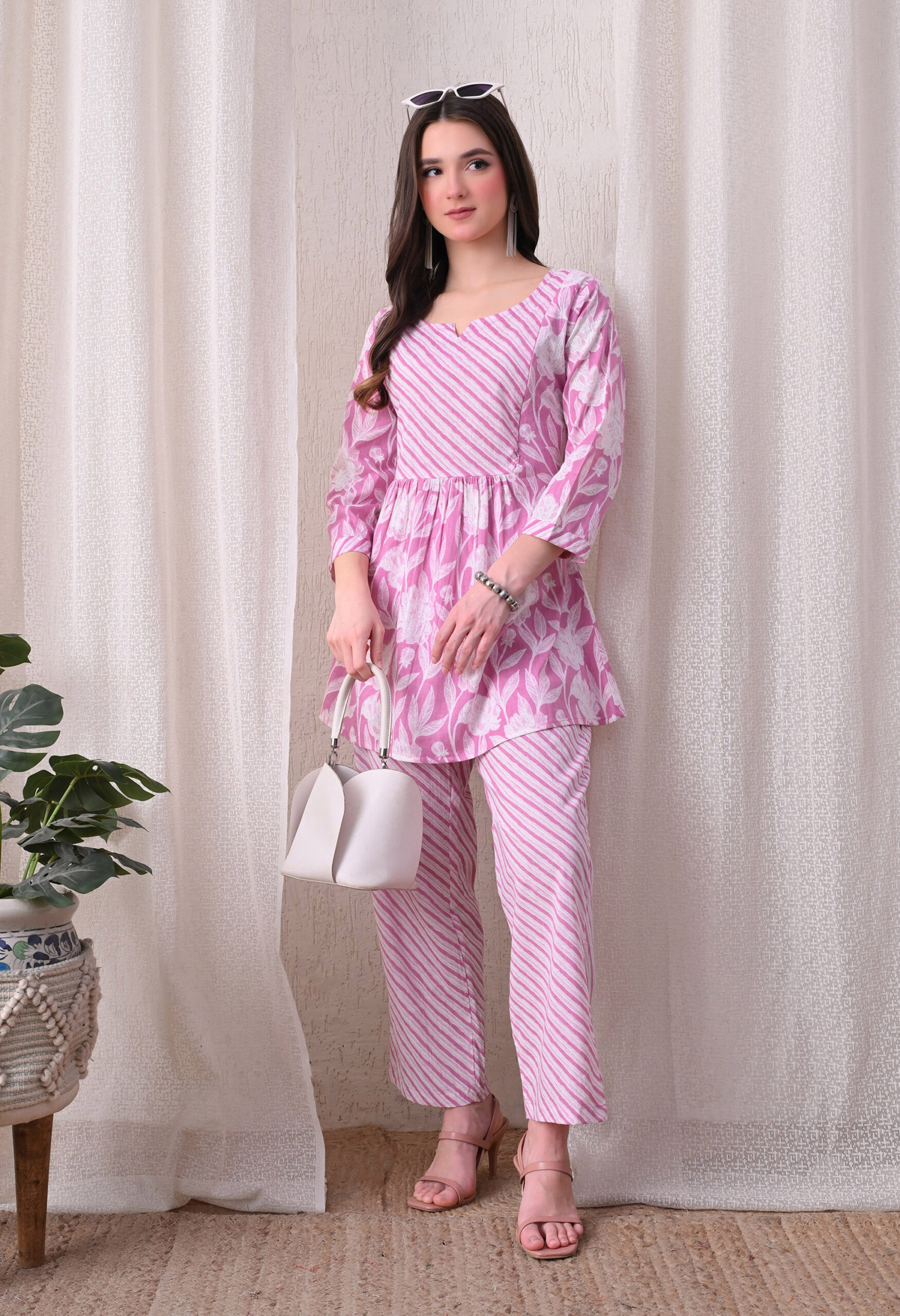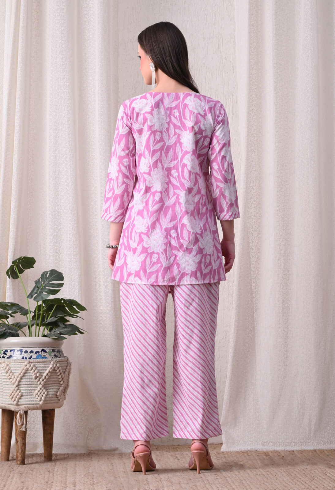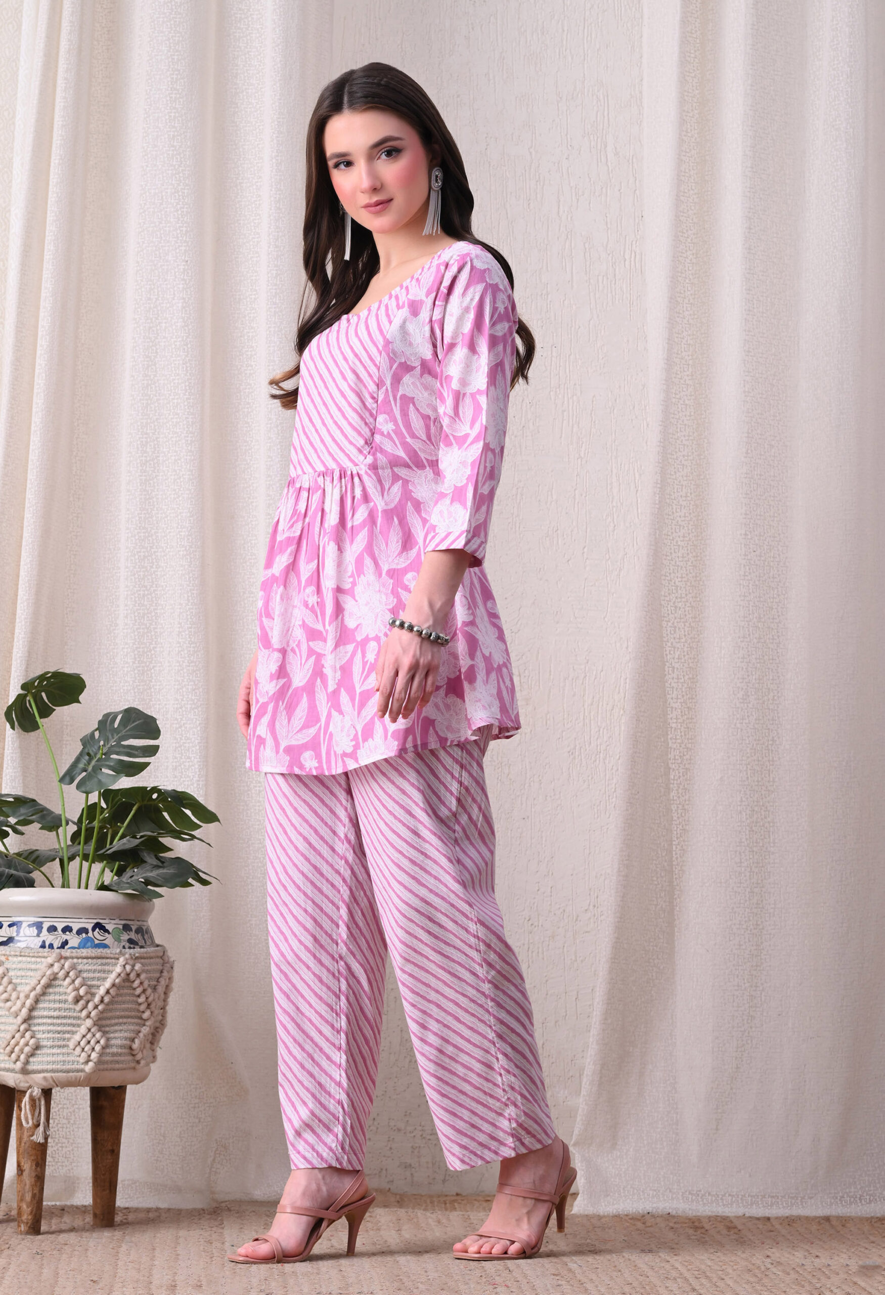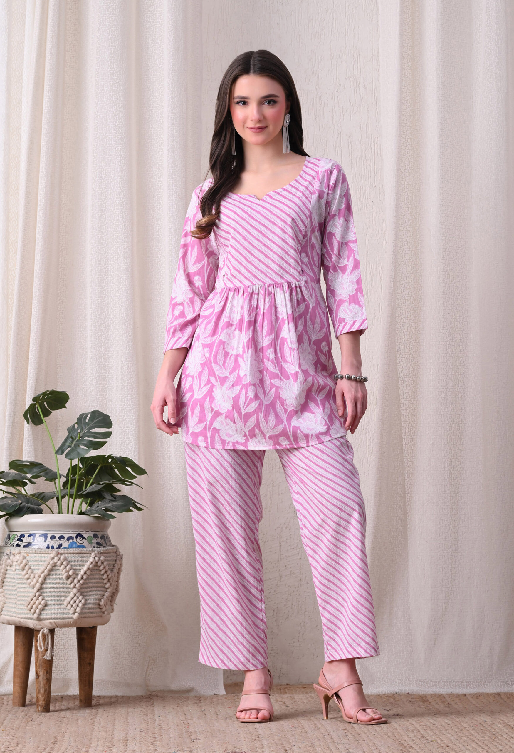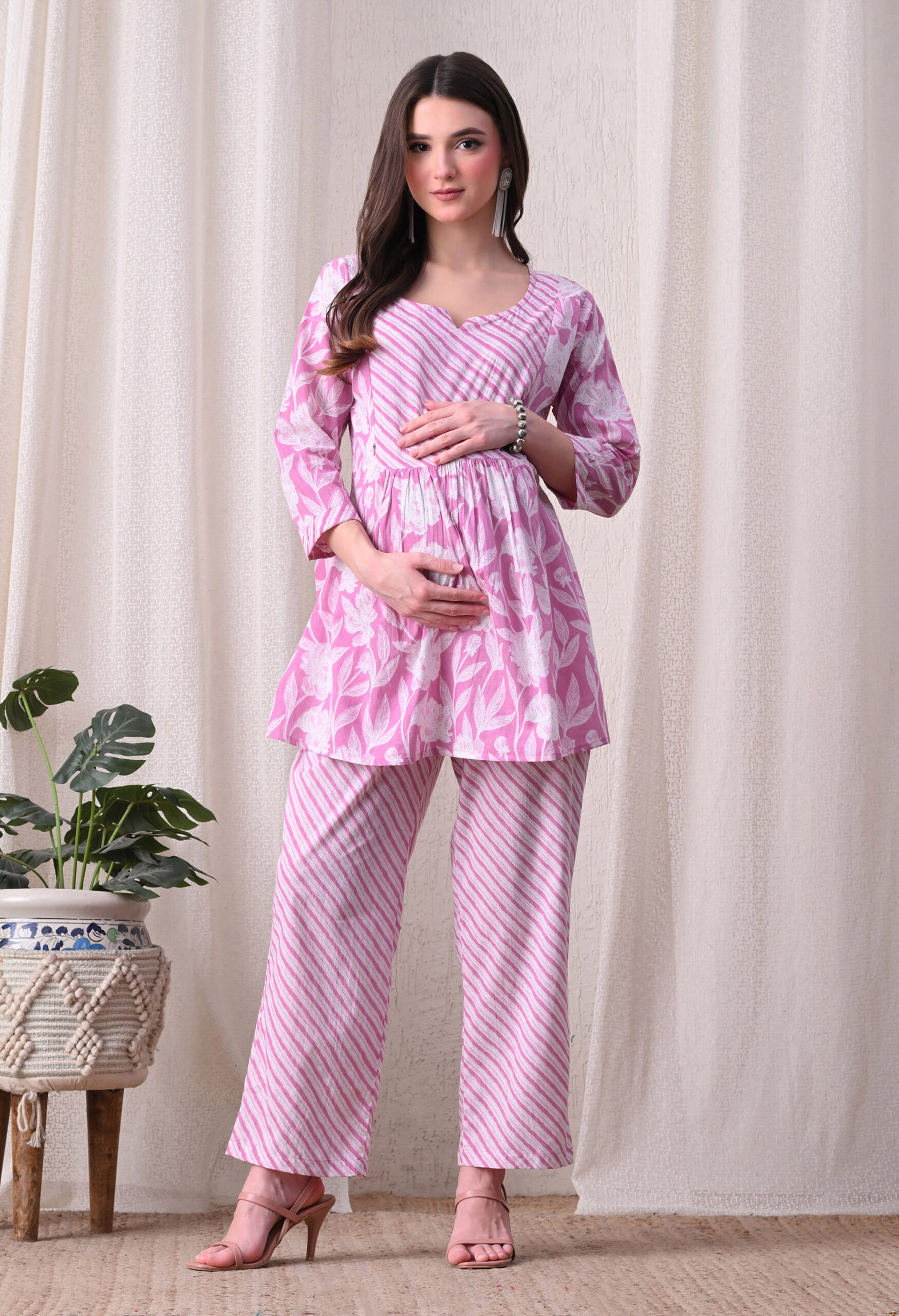 Embrace softness and style with this Ashvy India bubblegum pink mixed print cotton nursing maxi dress. Designed thoughtfully for nursing and expecting mothers, this maxi features a concealed zip nursing access for quick, easy, and completely private breastfeeding without any disruption to the outfit’s feminine charm. The contrast print design — a diagonal leheriya stripe on the fitted V-neck yoke and oversized white floral print on the flowy gathered skirt — creates a beautifully coordinated mixed print look.
