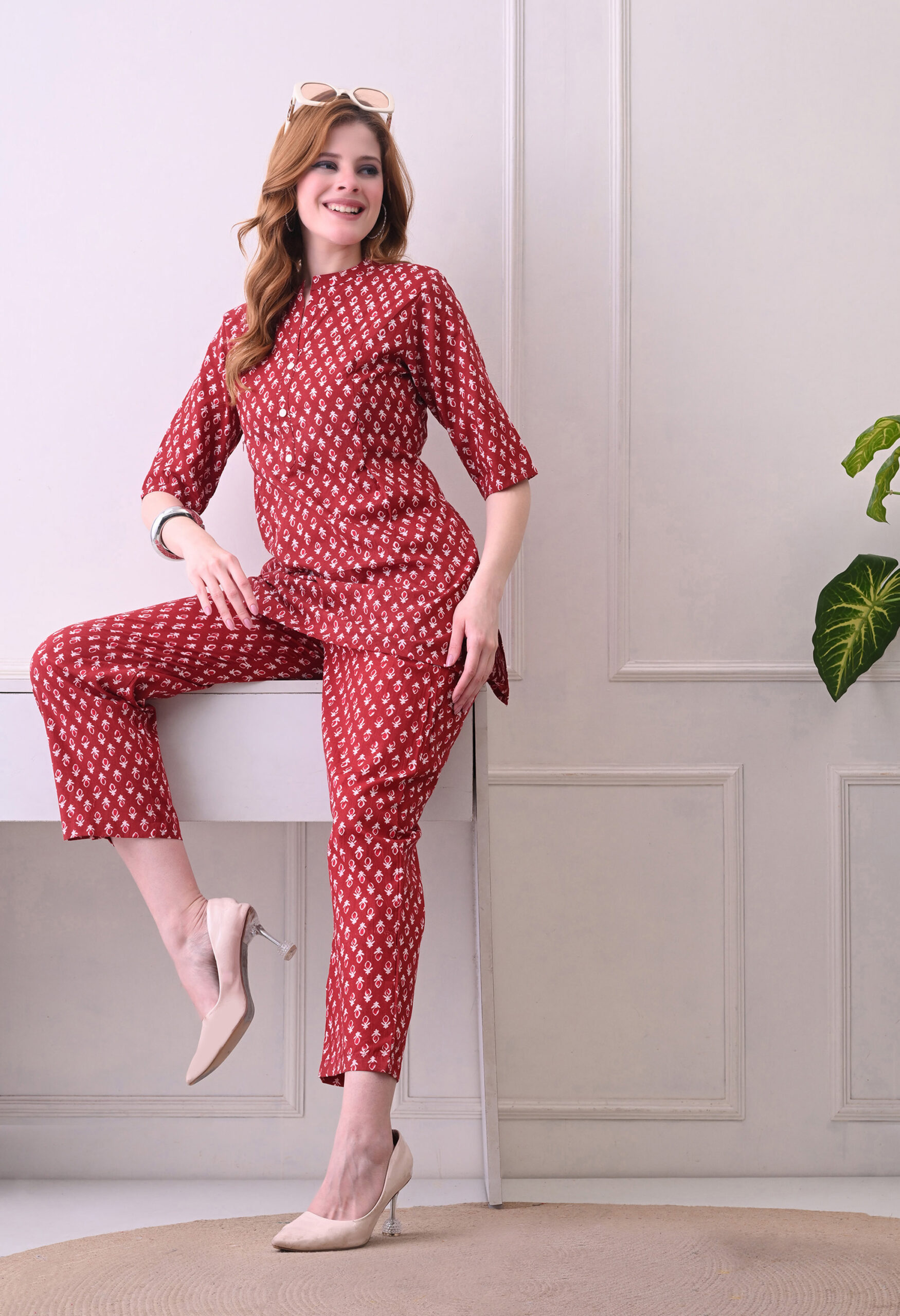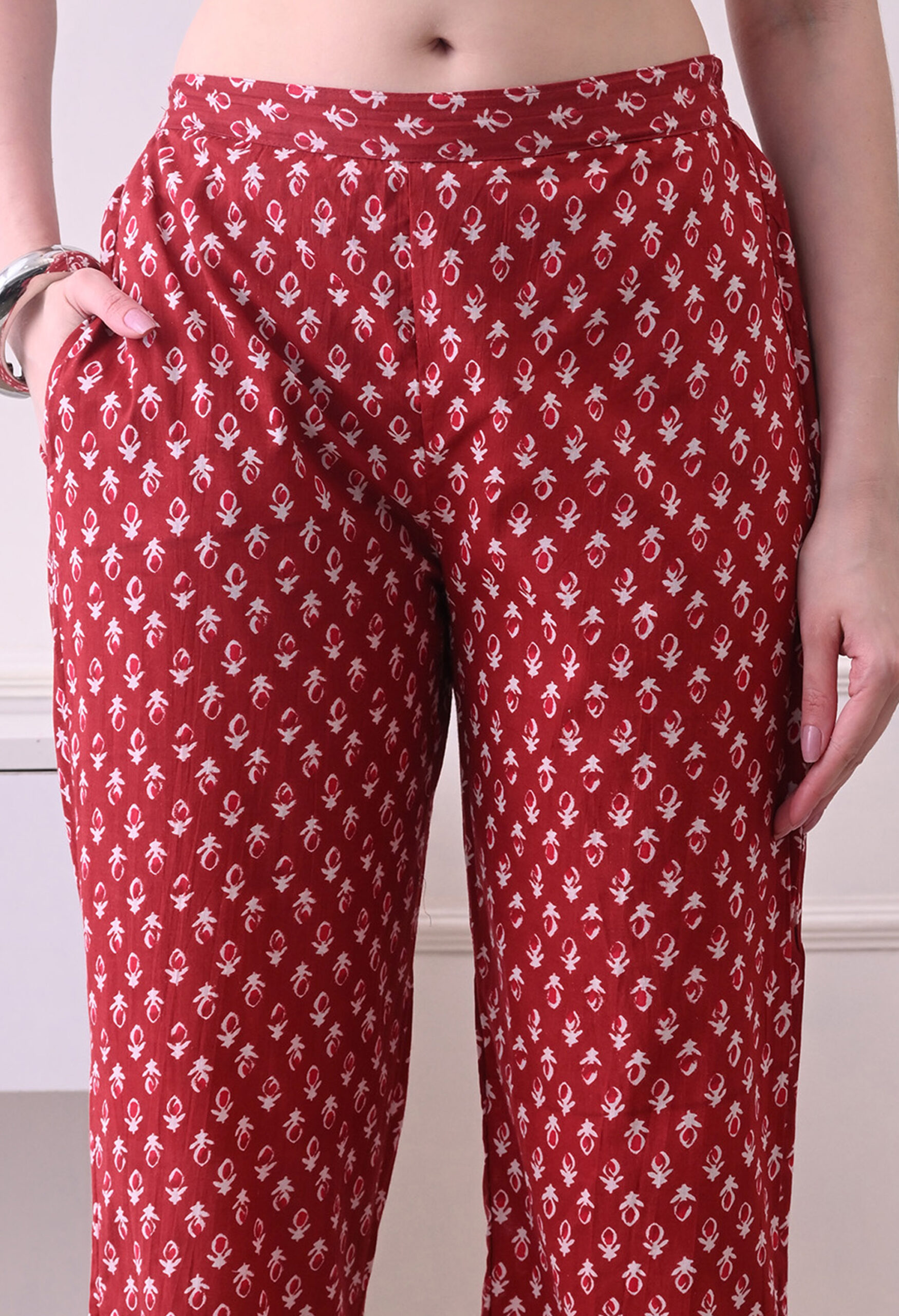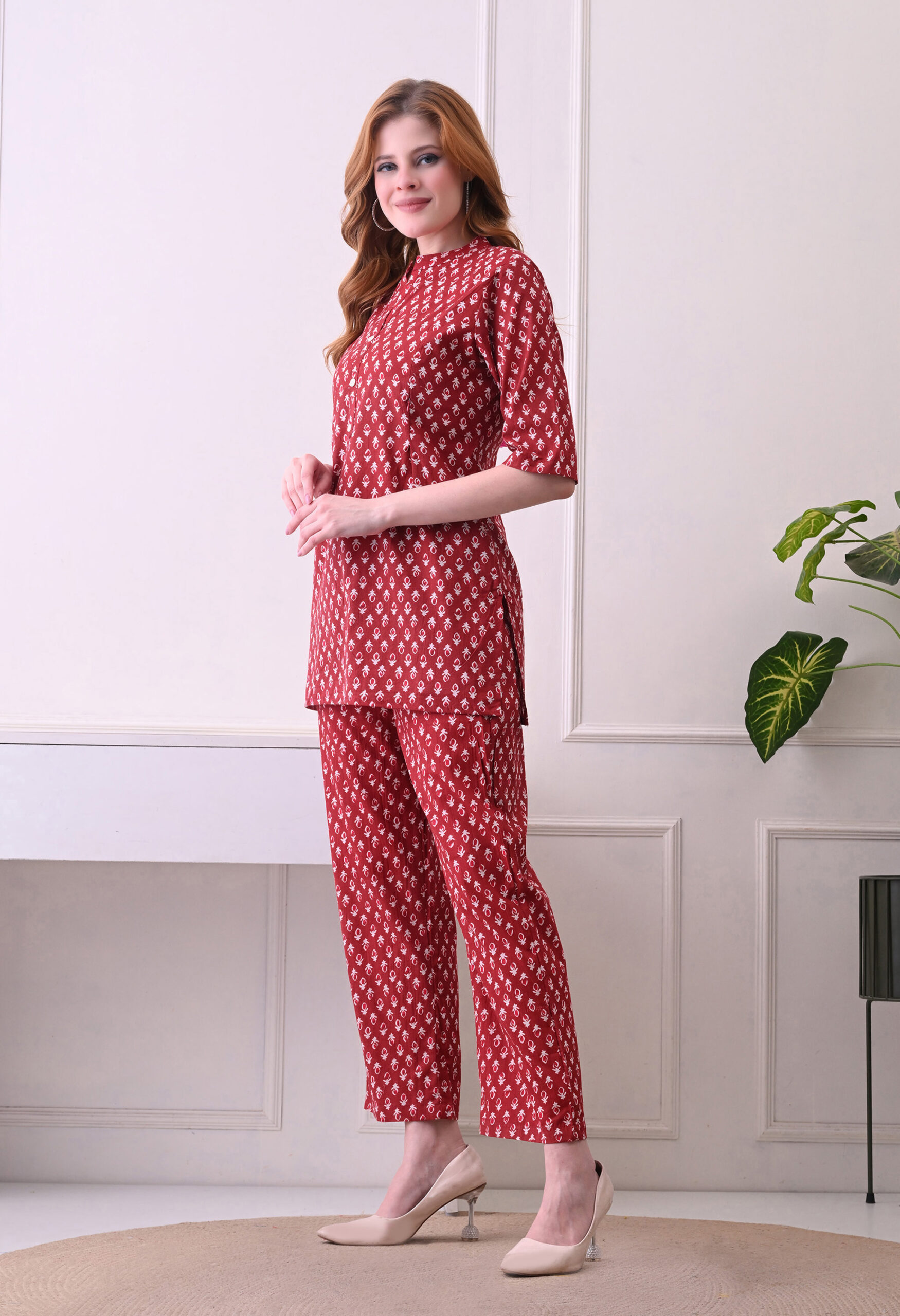 The rich crimson red base with delicate white and pink small ethnic motif print gives this kurta a classic, timeless ethnic appeal that is suitable for daily wear, hospital visits, post-partum outings, and relaxed family occasions. The mandarin collar and half sleeves add a smart, polished touch while the relaxed A-line silhouette provides generous room for your growing bump and comfortable movement.