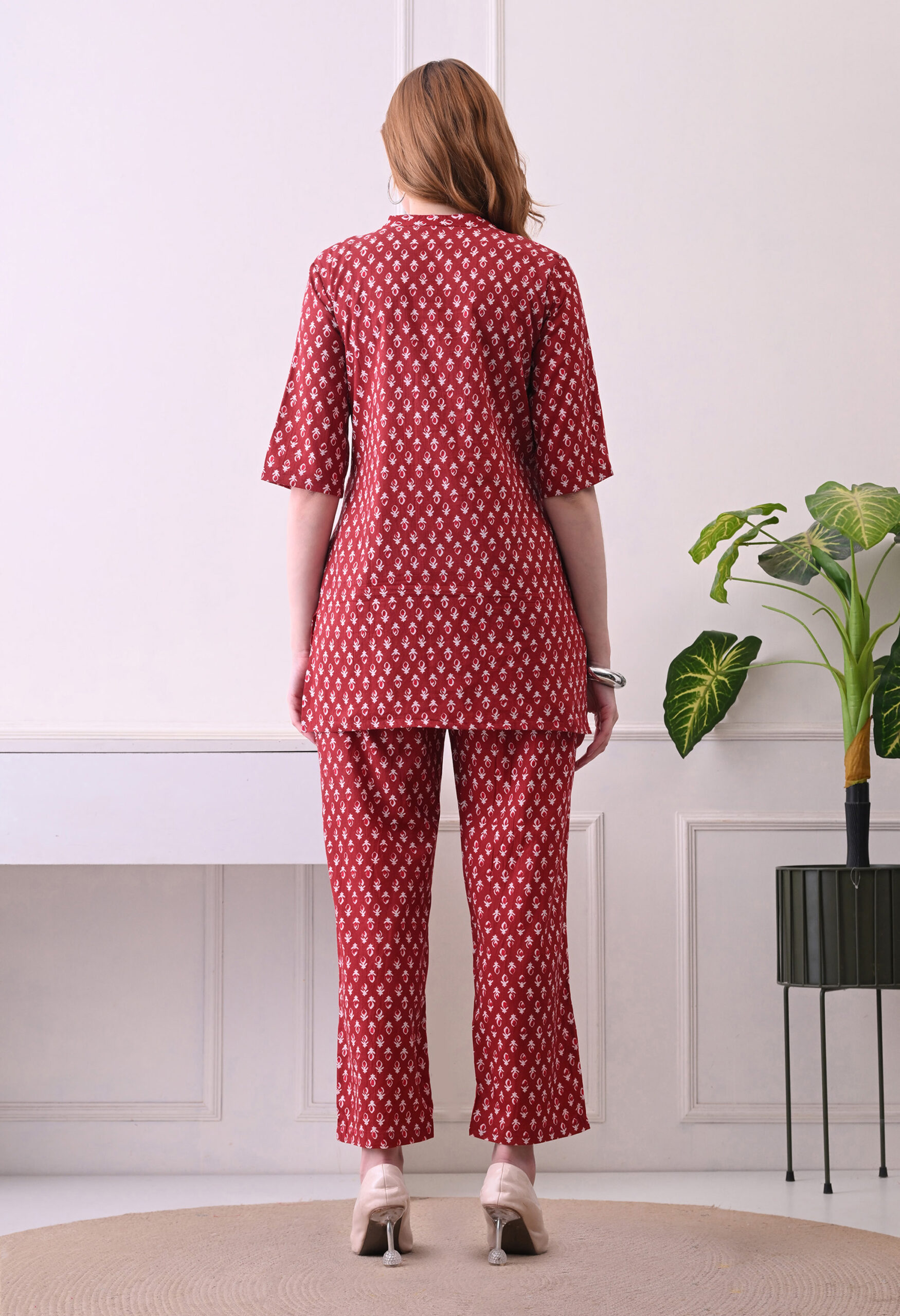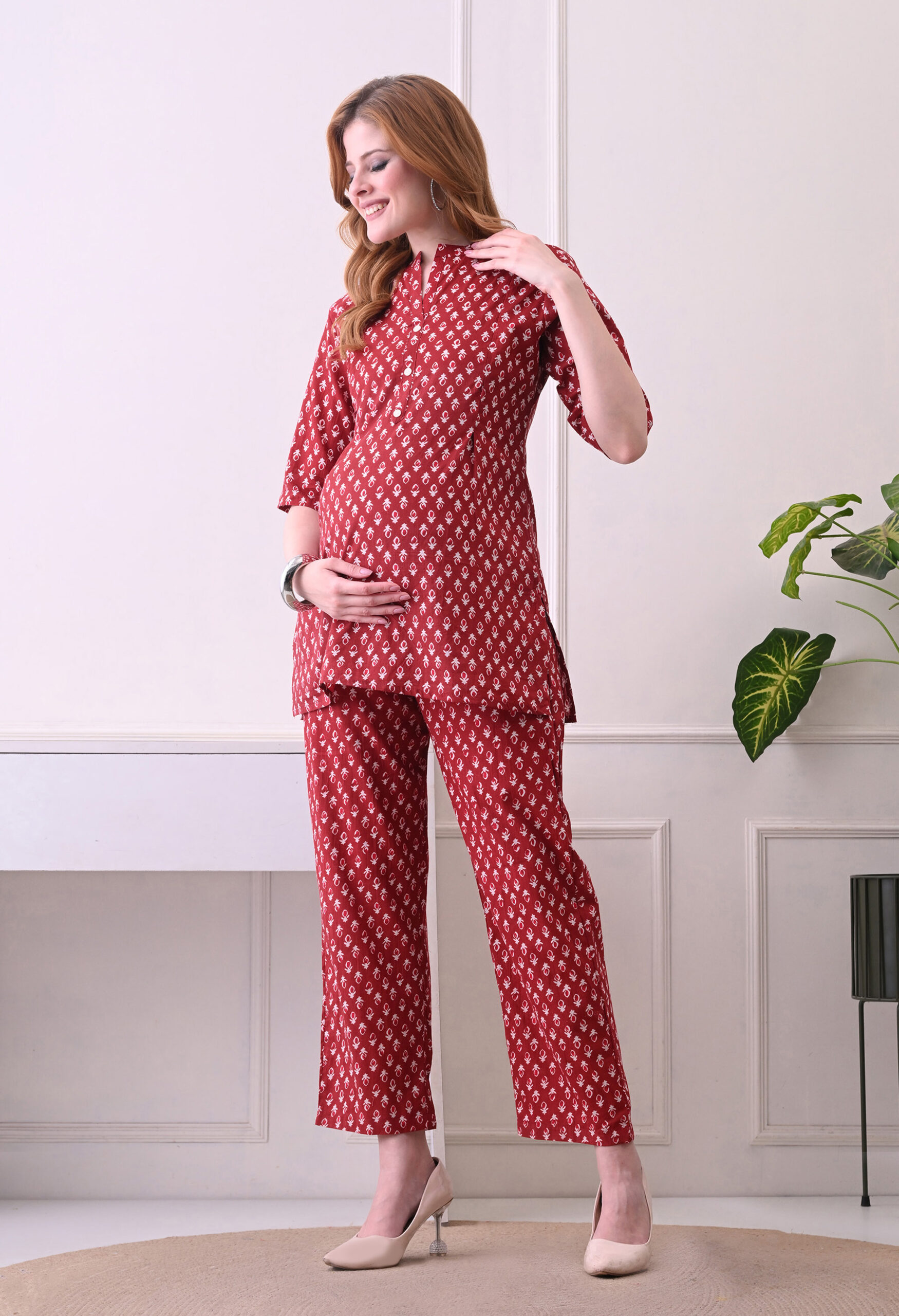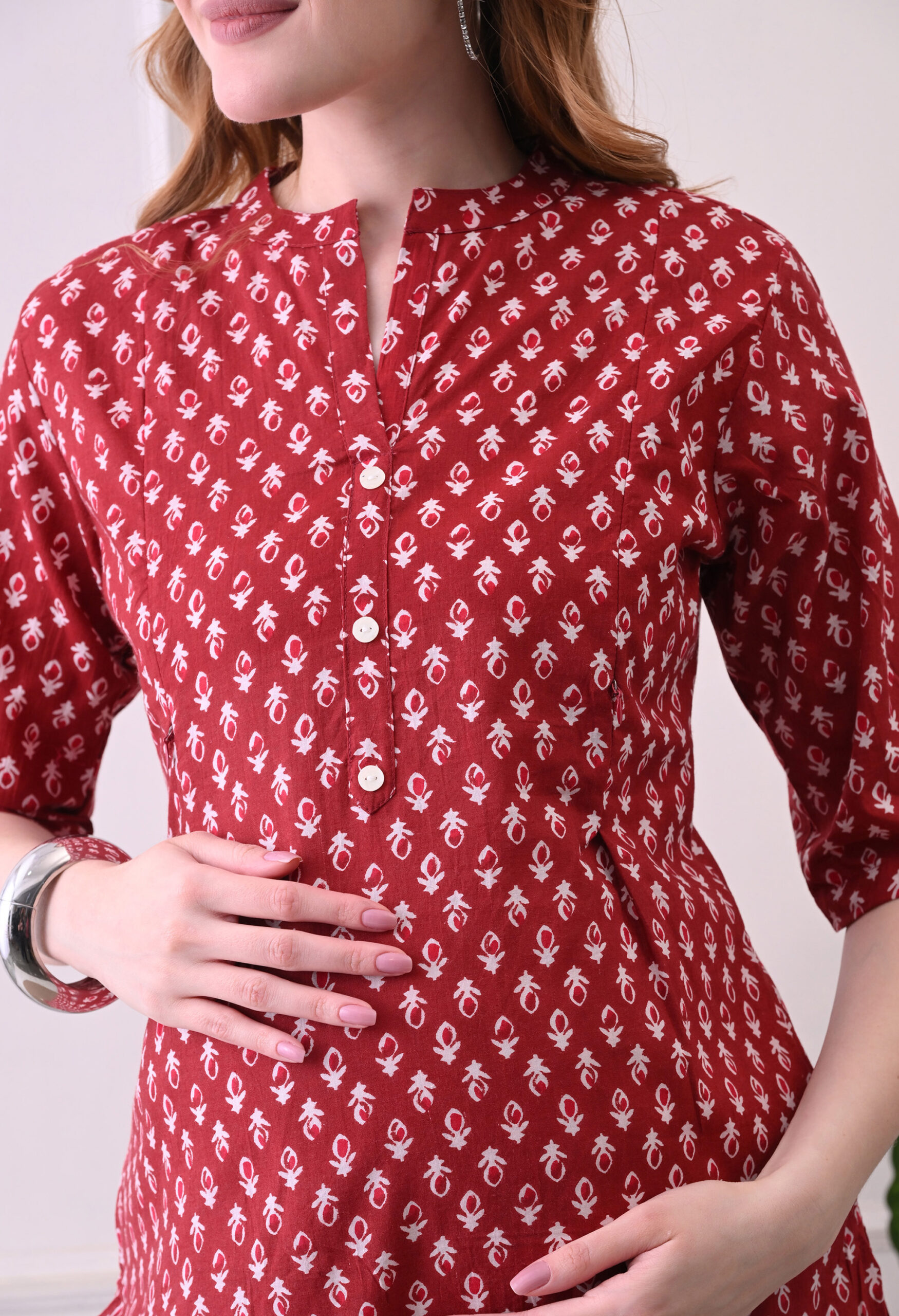Ashvy India – Crimson Red Ethnic Print Cotton Nursing Kurta with Button & Zip Access | Maternity Wear for Women