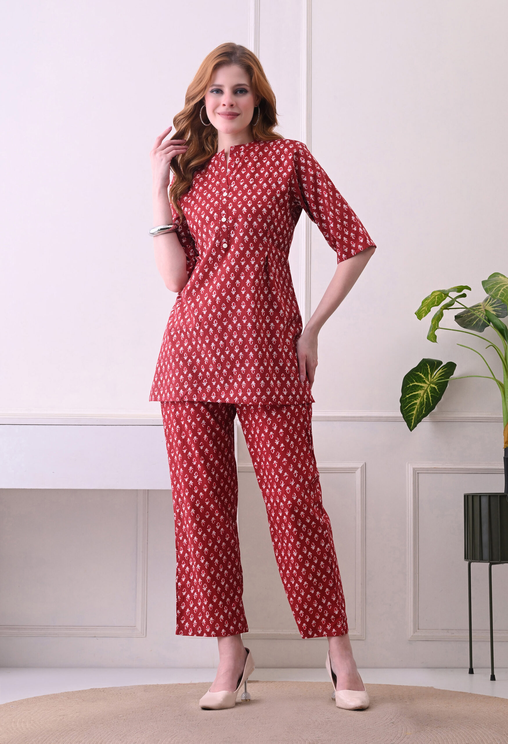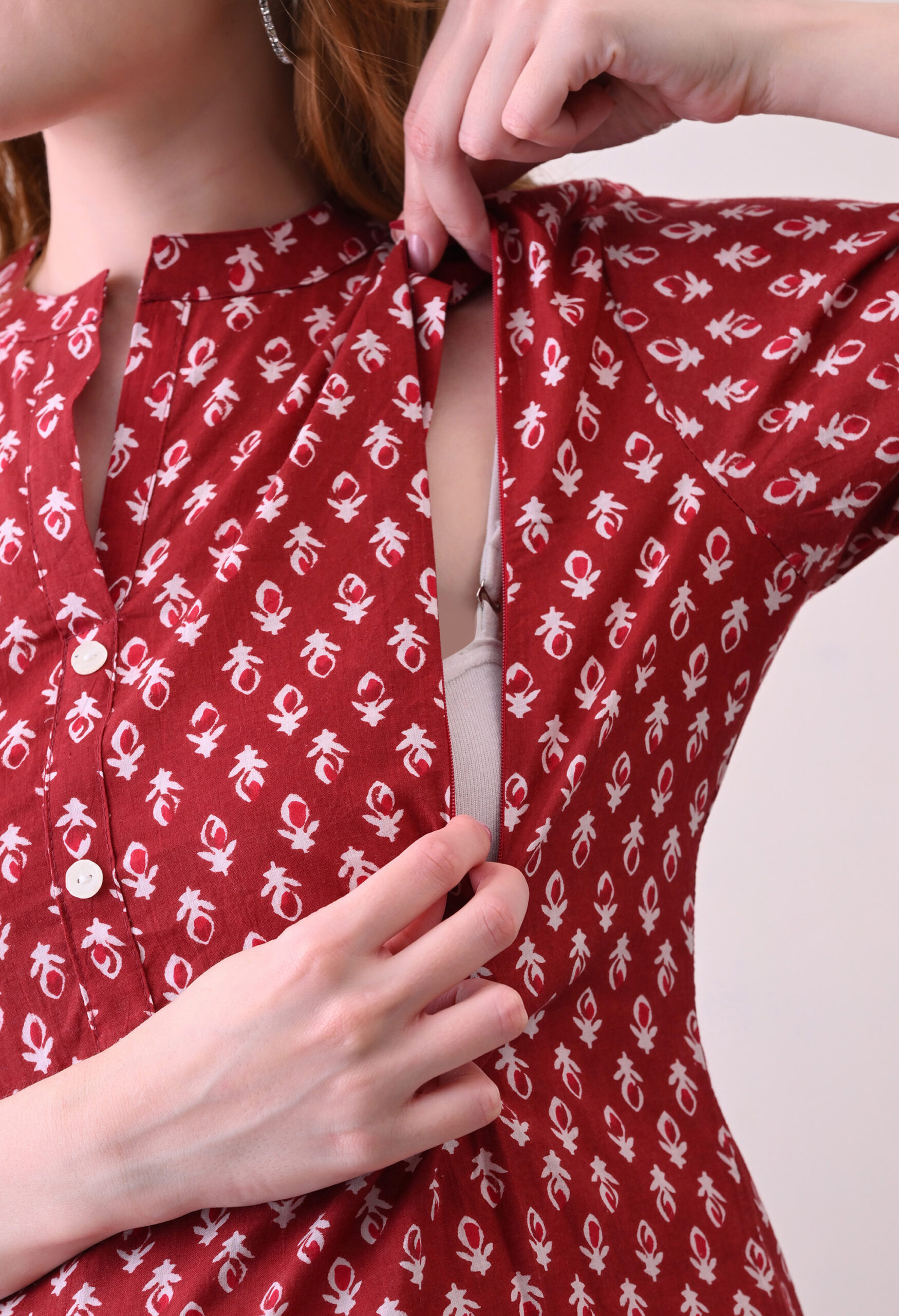 Thoughtfully designed for new and expecting mothers, this Ashvy India crimson red ethnic print cotton nursing kurta offers seamless functionality with beautiful traditional style. Crafted from soft breathable cotton, this kurta features a dual nursing access system — a concealed zip alongside a neat button placket — making breastfeeding quick, easy, and completely discreet while keeping the overall look clean and put-together.