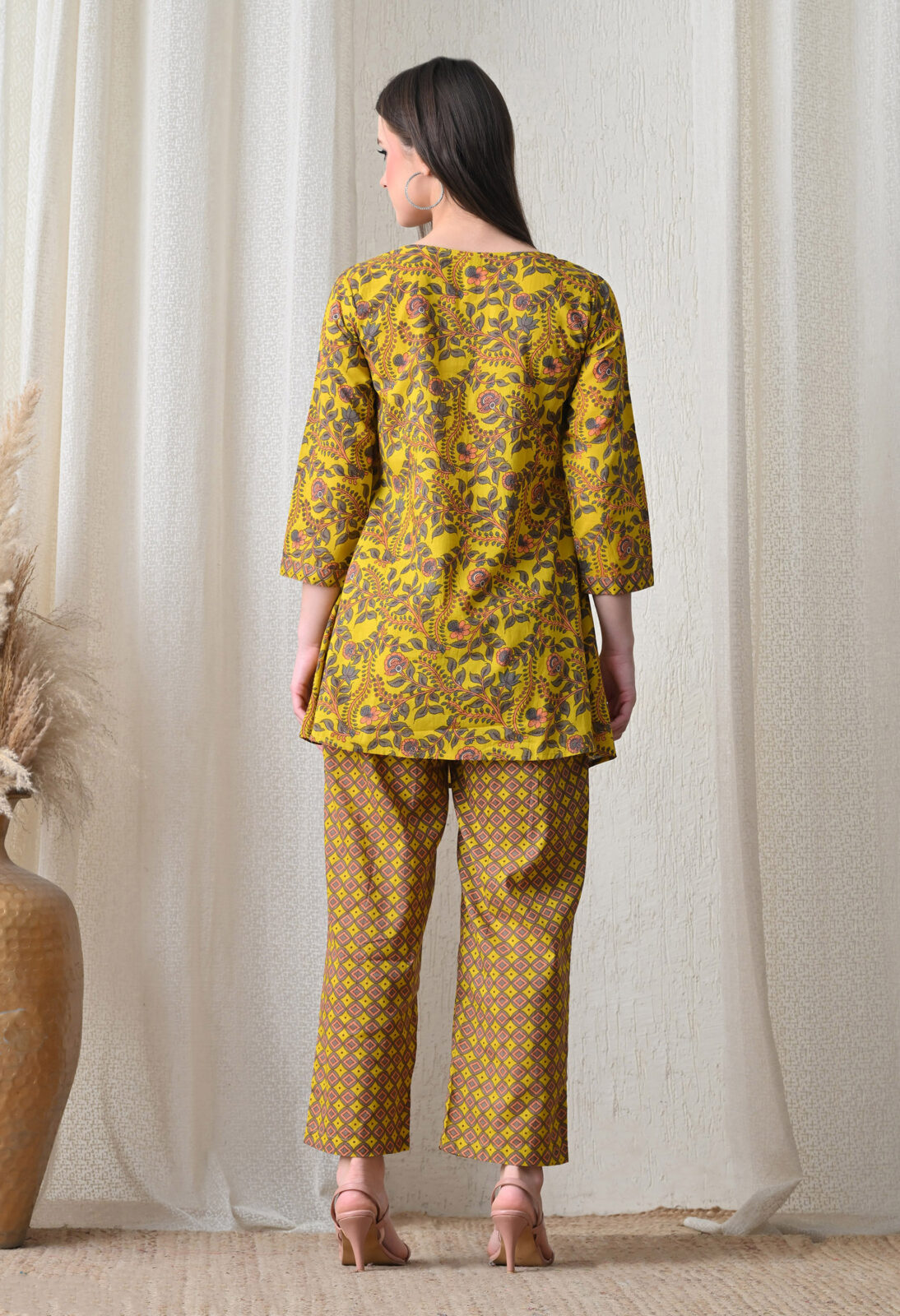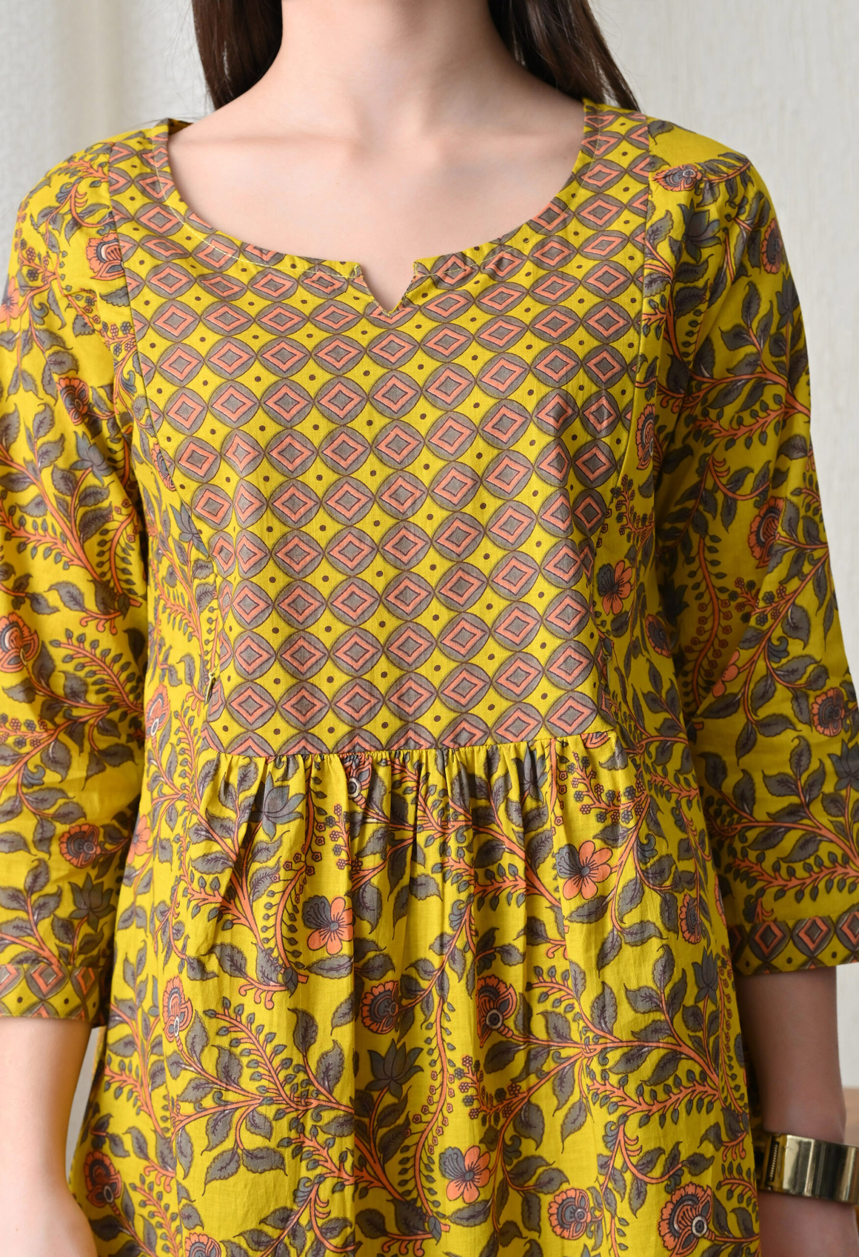 Make a warm, earthy style statement with this Ashvy India mustard yellow mixed print cotton nursing maxi dress. Thoughtfully designed for nursing and expecting mothers, this maxi features a concealed zip nursing access — opening discreetly from the center front for quick and completely private breastfeeding without disturbing the outfit’s beautiful design. The contrast print layout — a geometric diamond lattice print on the fitted square-neck yoke and a dense floral vine print on the gathered skirt — creates a rich, layered ethnic aesthetic.