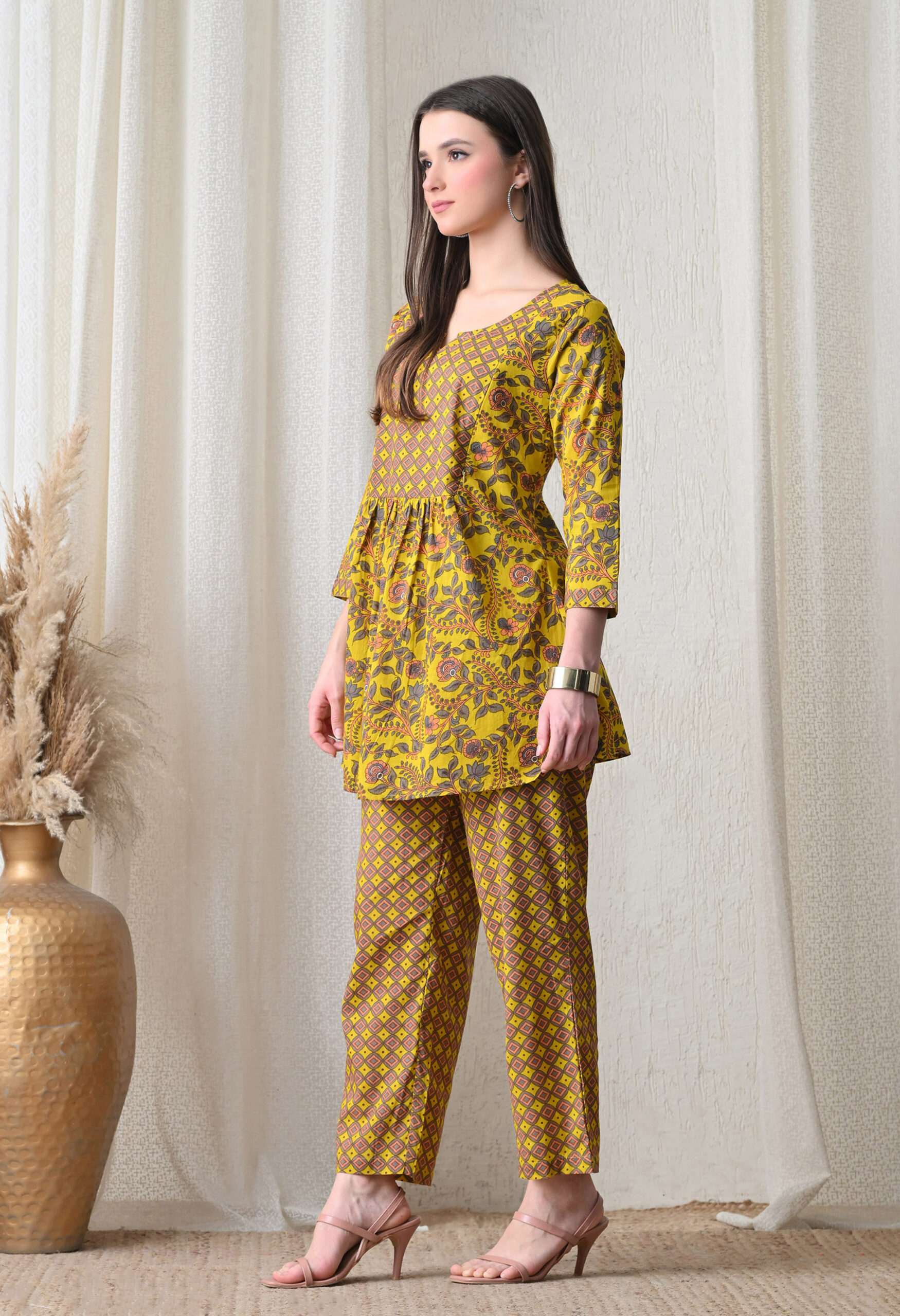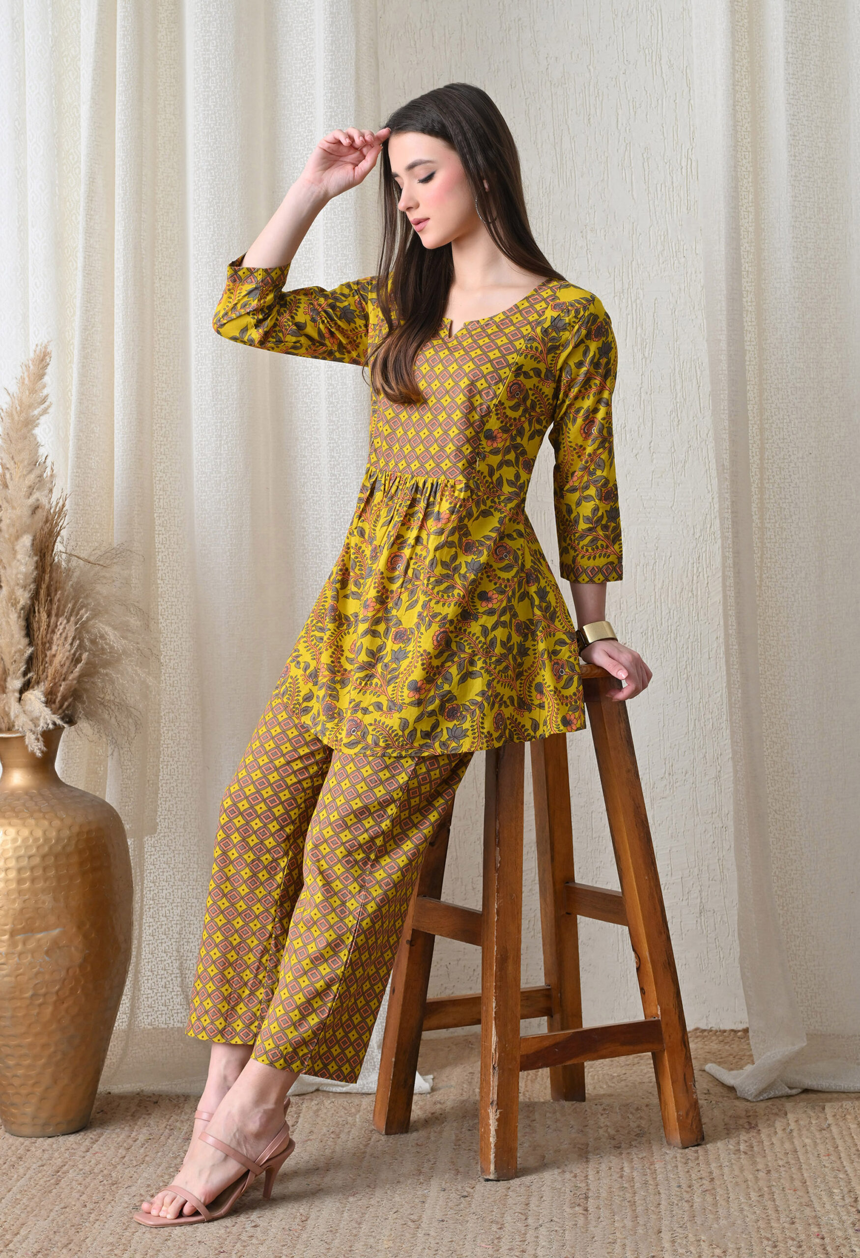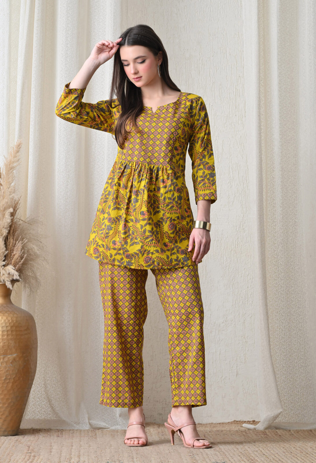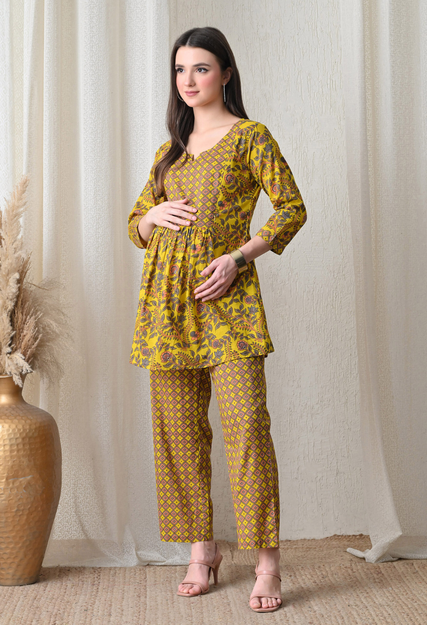 The vibrant mustard yellow base with peach, grey, and brown prints gives this maxi a warm, festive, and distinctly Indian charm. It is ideal for daily home wear, baby showers, post-partum casual occasions, and relaxed ethnic gatherings. The square neckline with a V-notch opening and fitted yoke provides an elegant silhouette, while the empire waist gathering creates generous room for the bump. The 3/4 sleeves with matching print add a polished, fully coordinated finish.