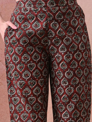 The soft peach pink base with pink, green, and white prints gives this co-ord set a fresh, romantic aesthetic that is versatile for home wear, baby showers, casual family outings, and relaxed post-partum dressing. The V-neckline with a fitted yoke and gathered empire waist provides a flattering, comfortable fit throughout pregnancy and beyond. The 3/4 sleeves add elegant coverage, while the matching elasticated waist straight trousers in the small tulip buti print complete the look for a fully coordinated outfit.