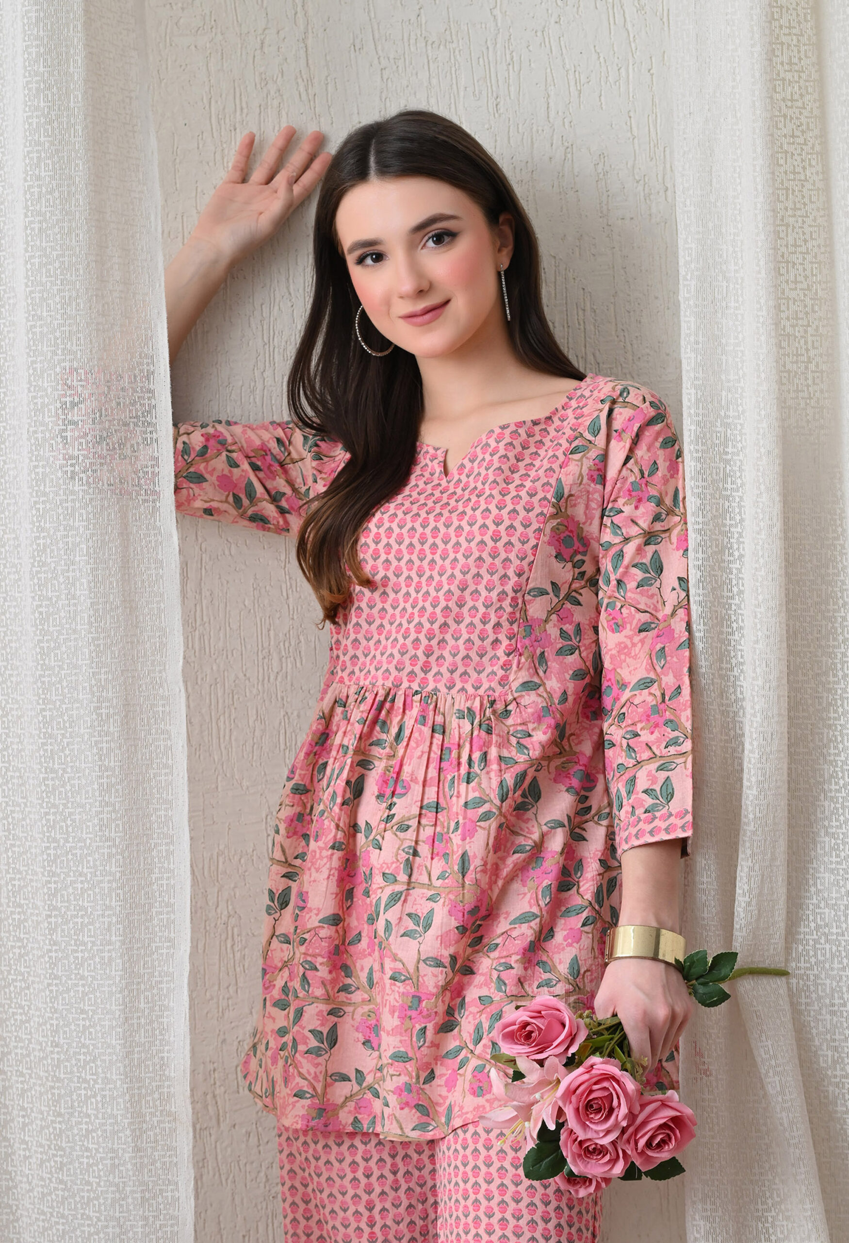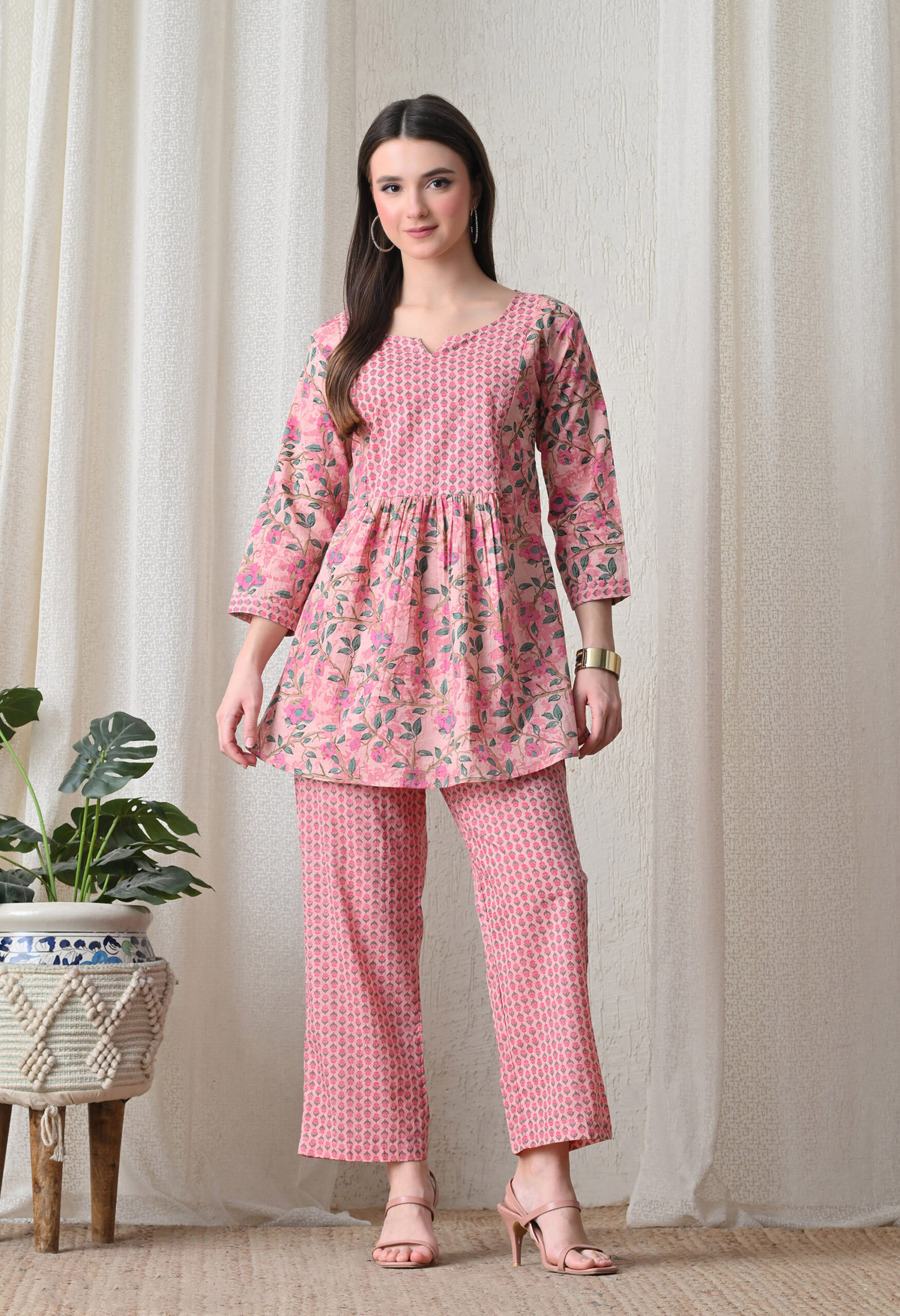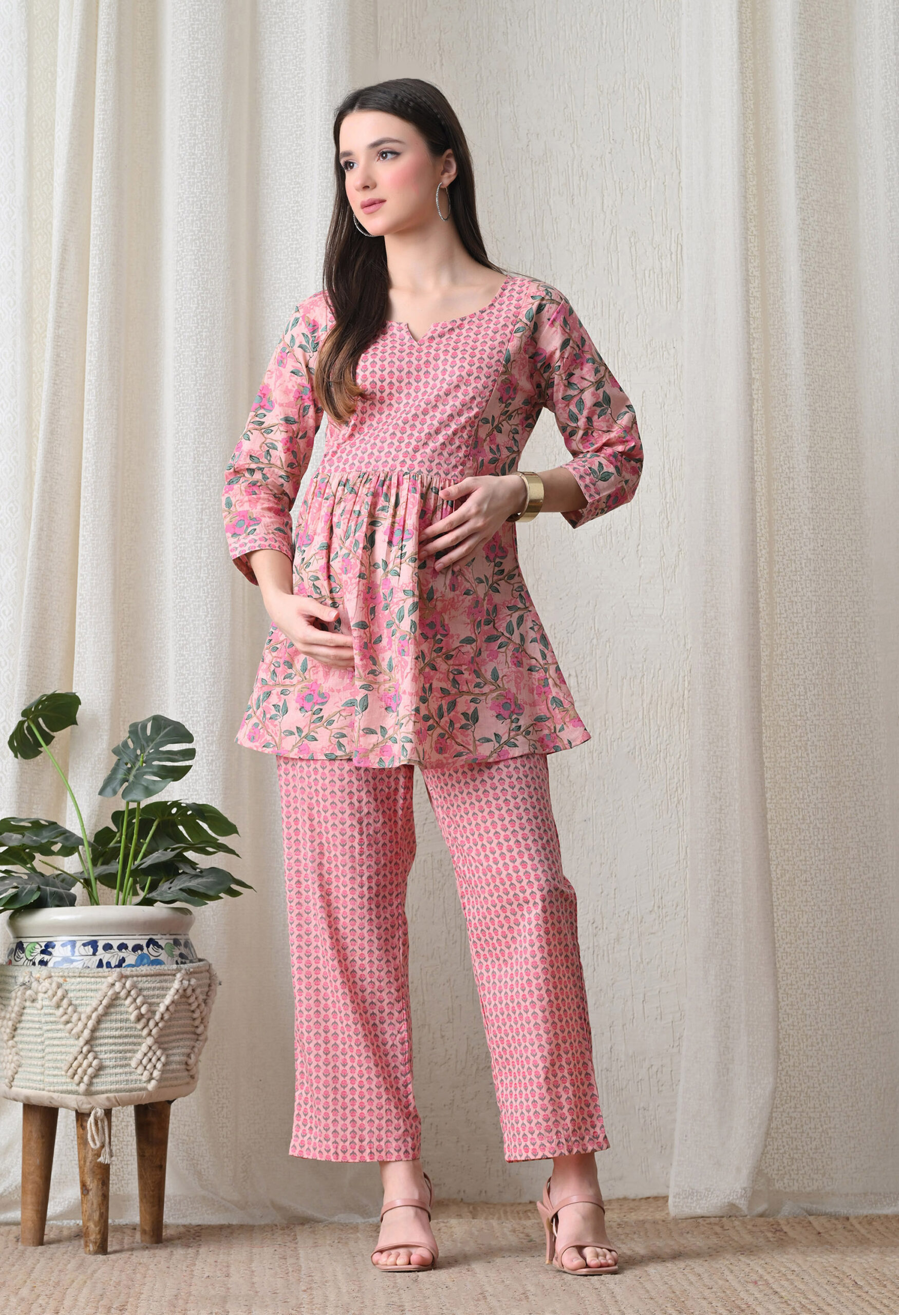 Ashvy India – Peach Pink Mixed Print Cotton Nursing Kurti & Trouser Co-Ord Set with Zip Access | Maternity Wear for Women