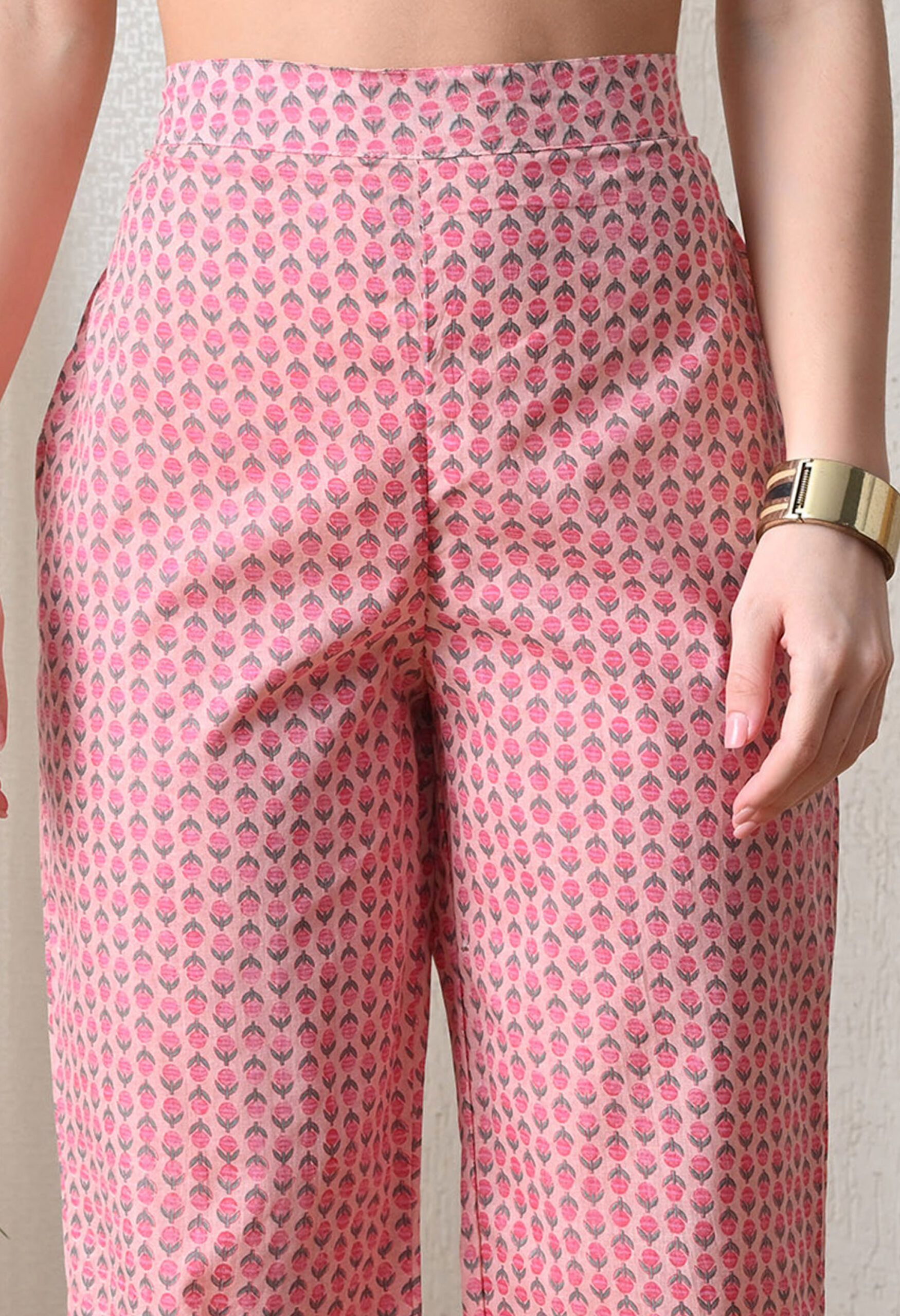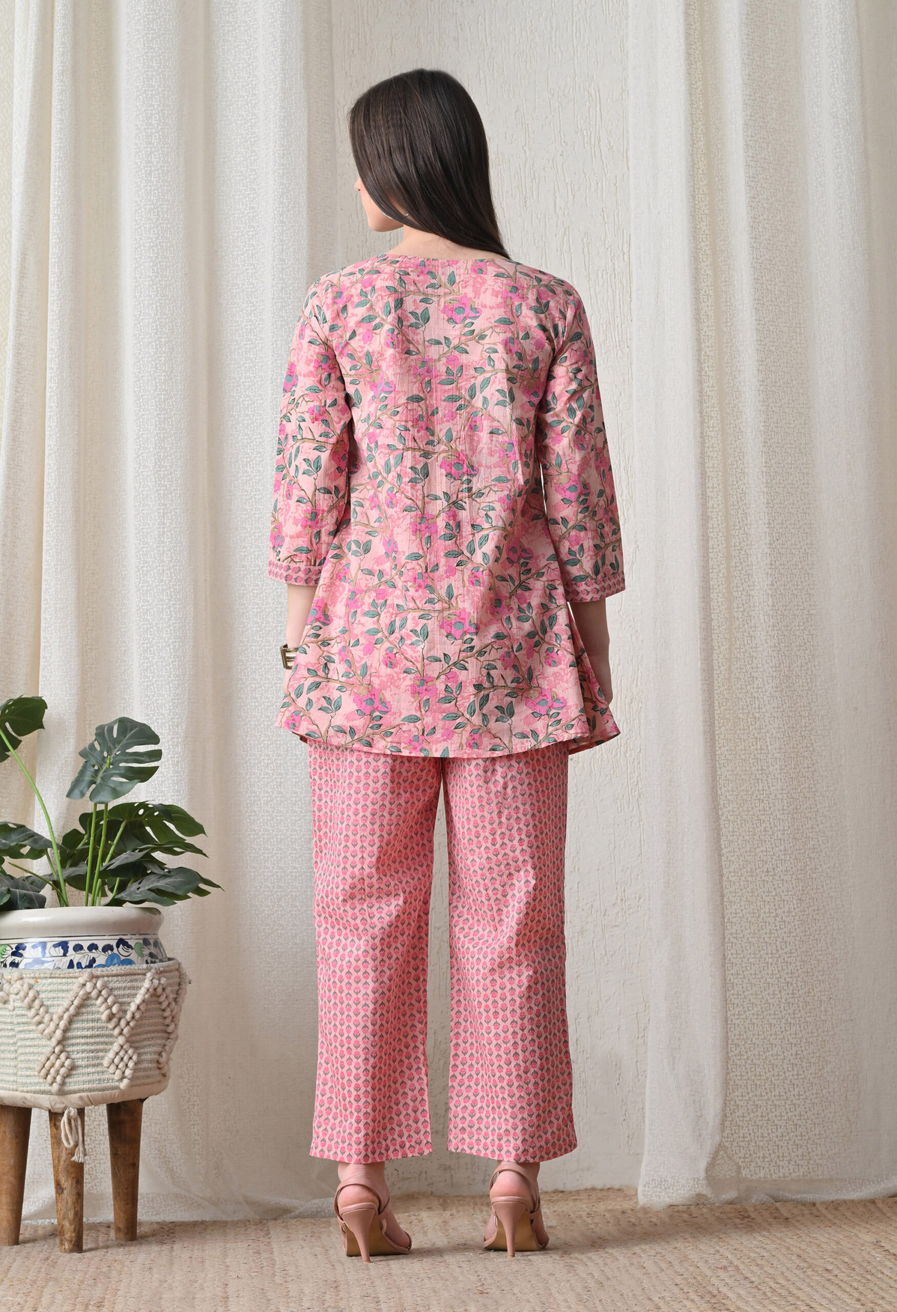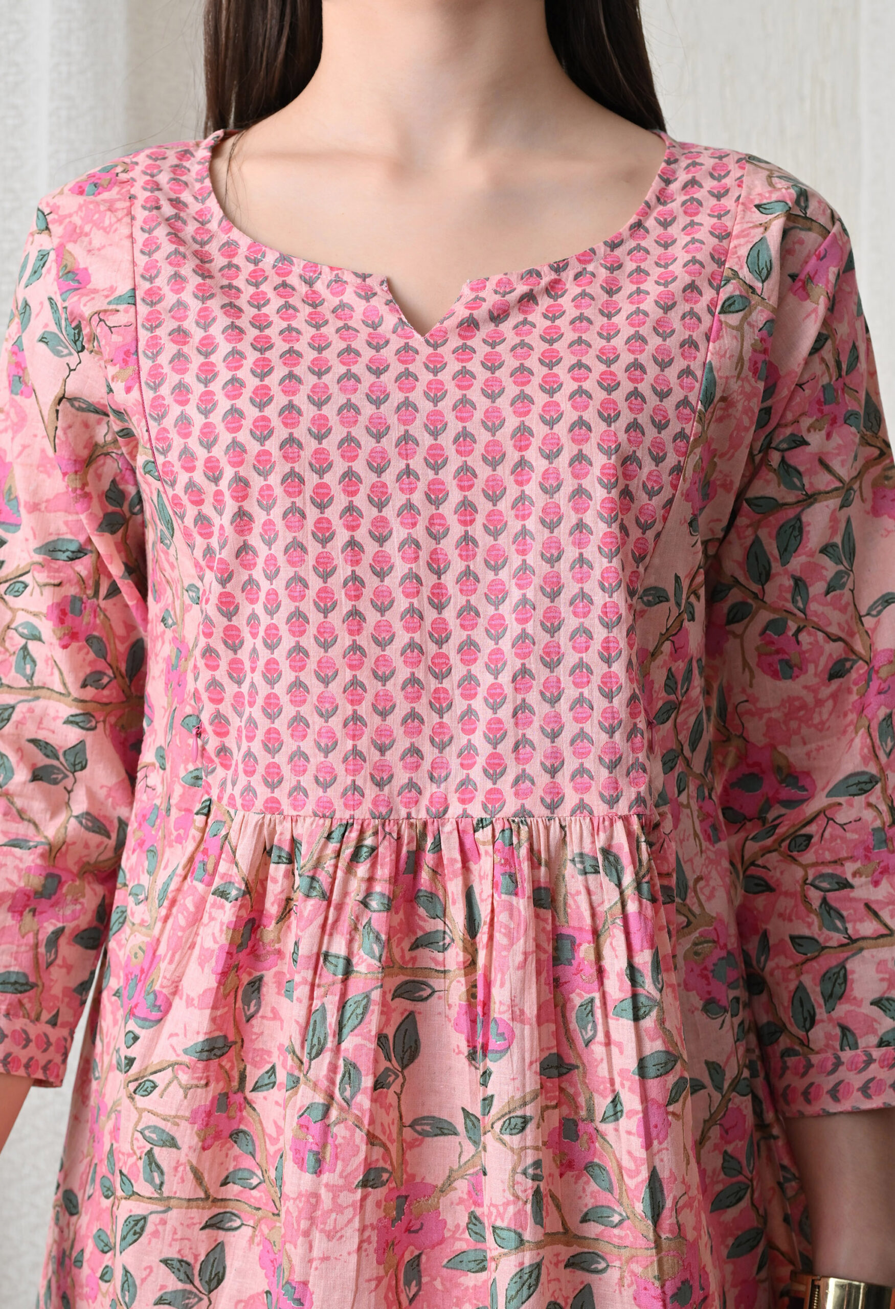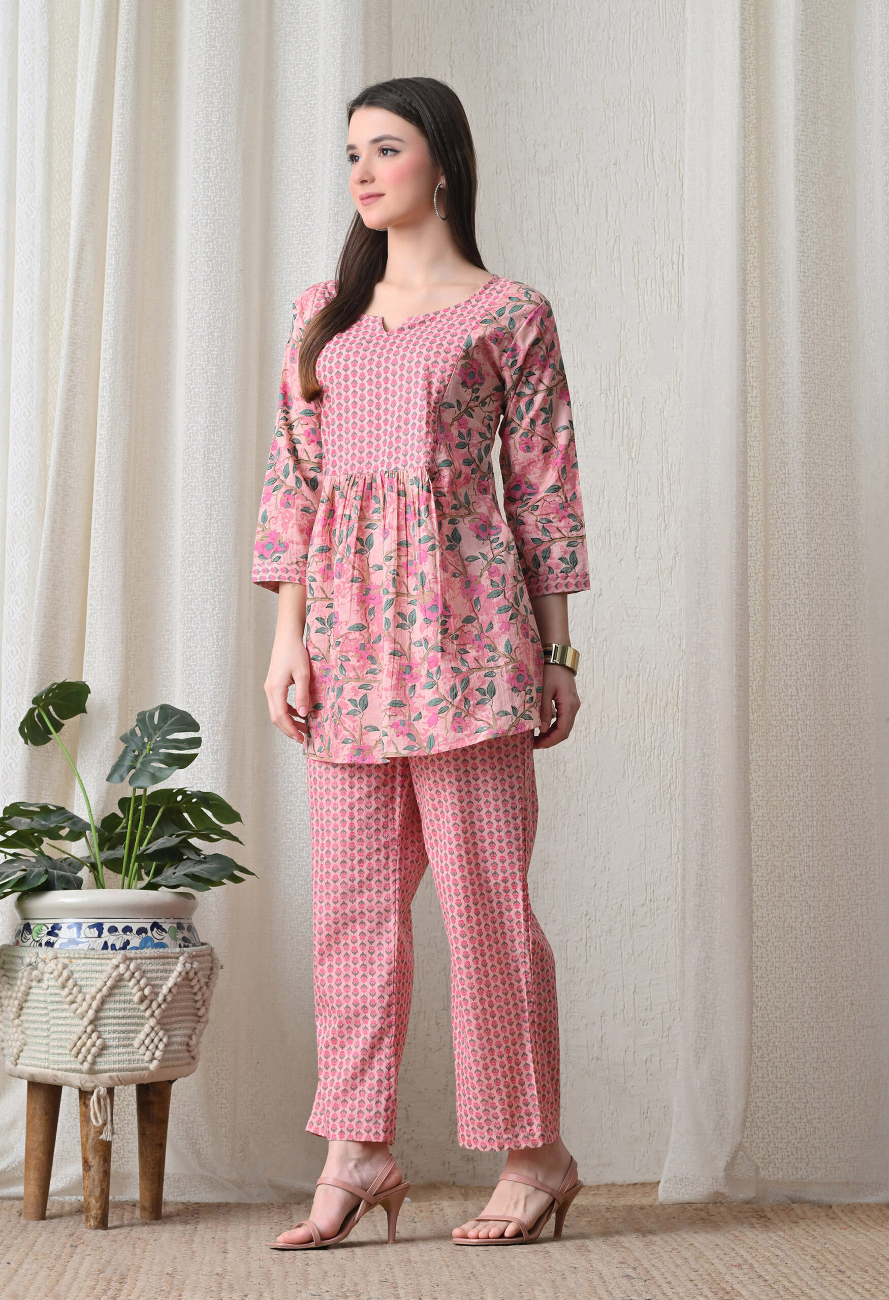 Ashvy India – Peach Pink Mixed Print Cotton Nursing Kurti & Trouser Co-Ord Set with Zip Access | Maternity Wear for Women