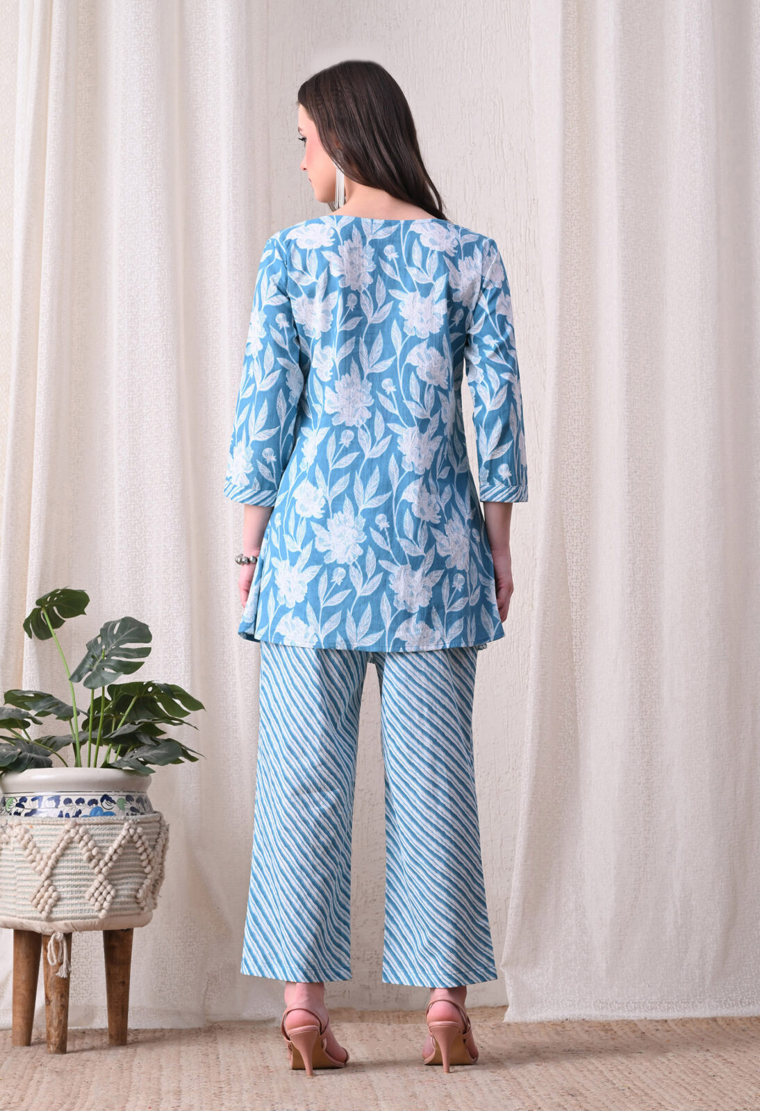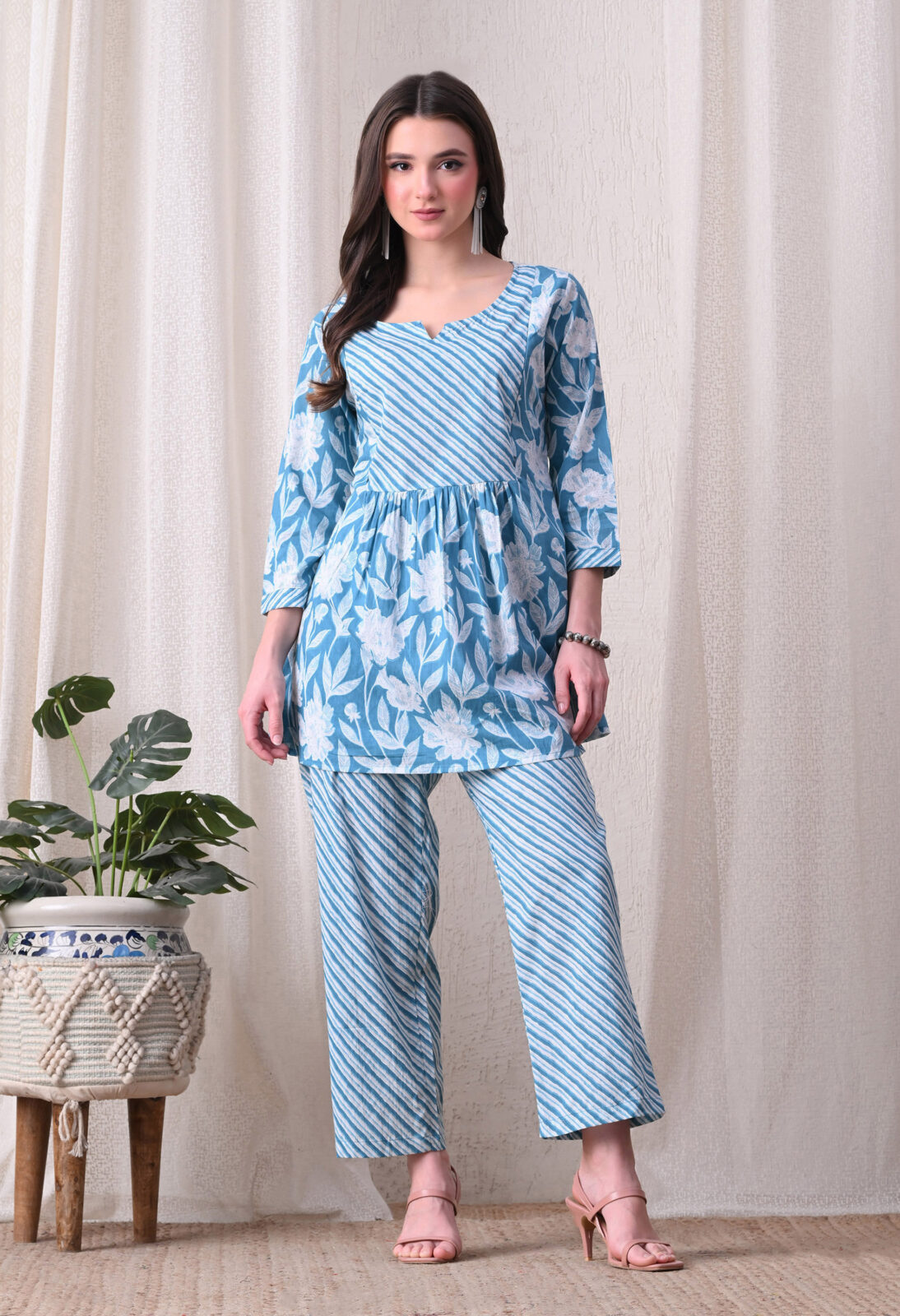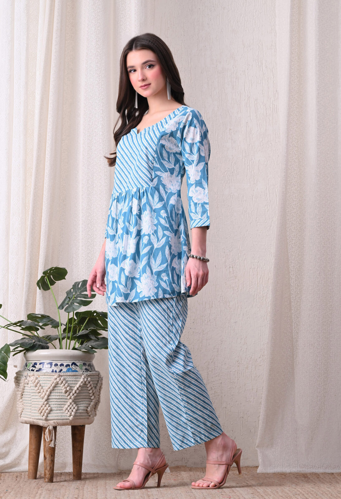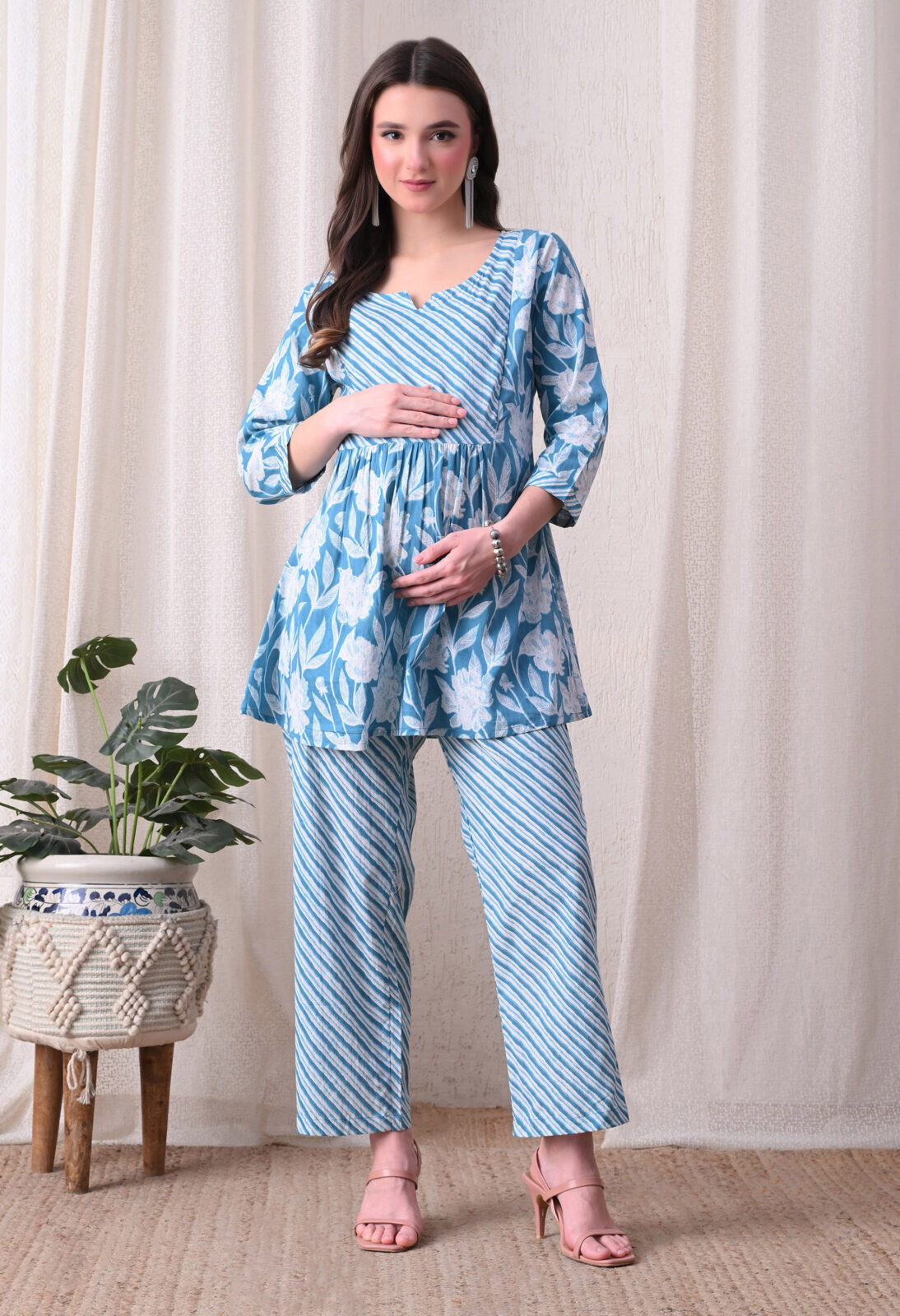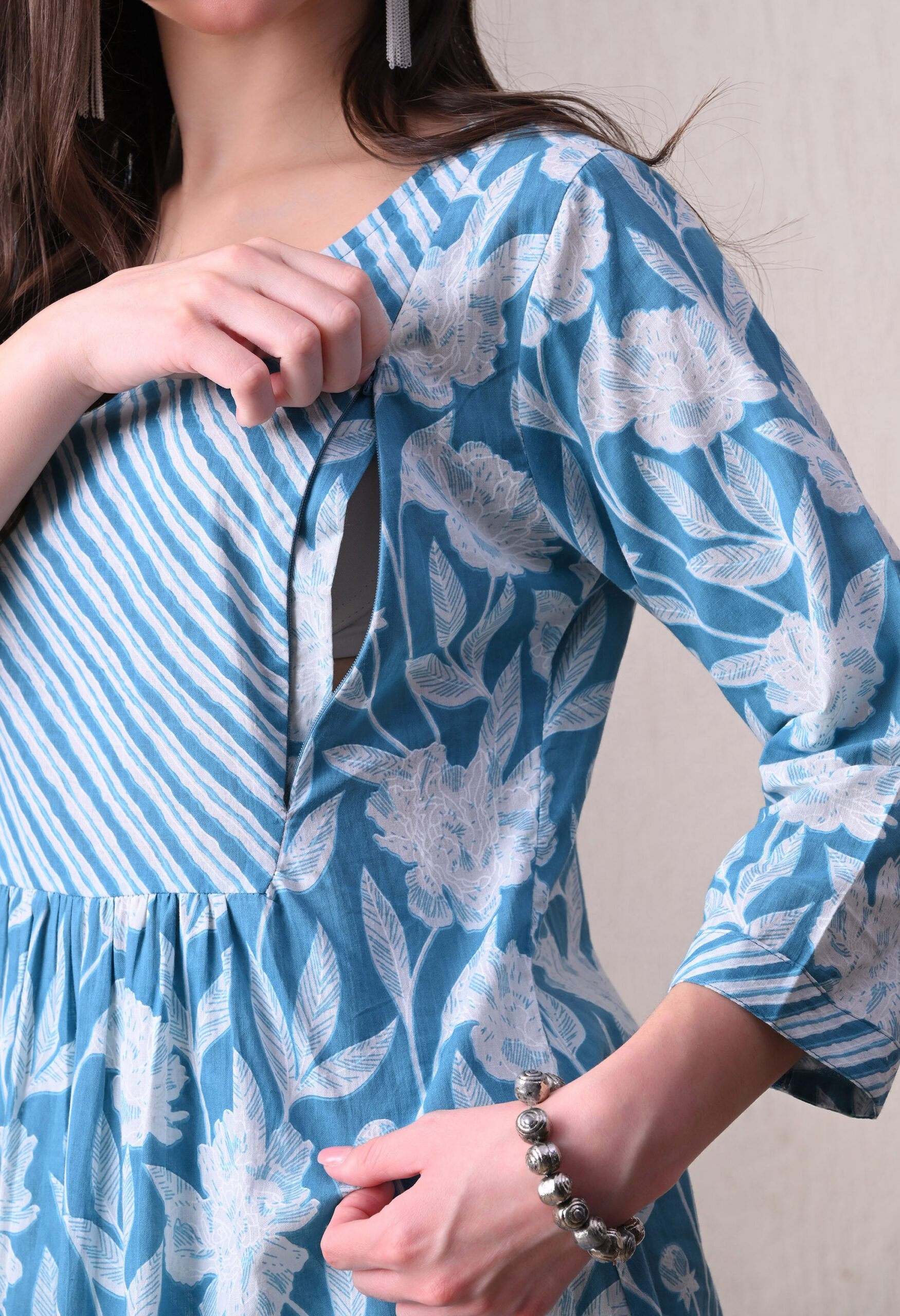 Elevate your maternity wardrobe with this Ashvy India steel blue mixed print cotton nursing maxi dress. Thoughtfully crafted for nursing and expecting mothers, this maxi dress features a concealed zip nursing access that allows quick, easy, and completely discreet breastfeeding without disrupting the elegance of the outfit. The contrast design — a diagonal leheriya stripe print on the fitted V-neck yoke and bold large white floral print on the flowy gathered skirt — creates a beautifully distinctive mixed print silhouette.