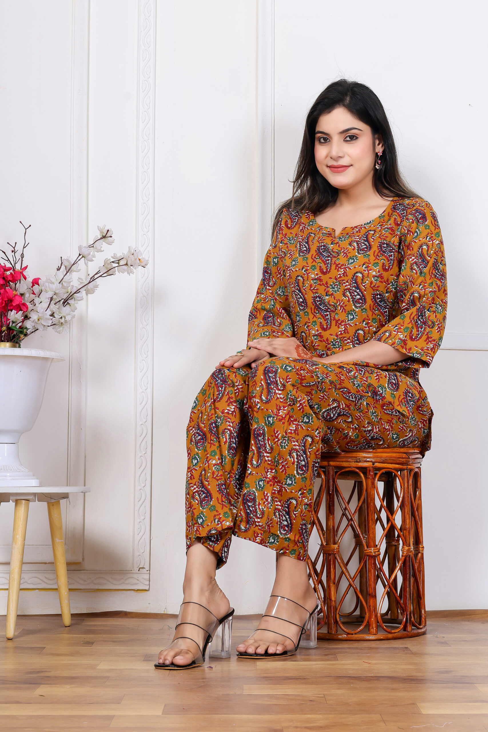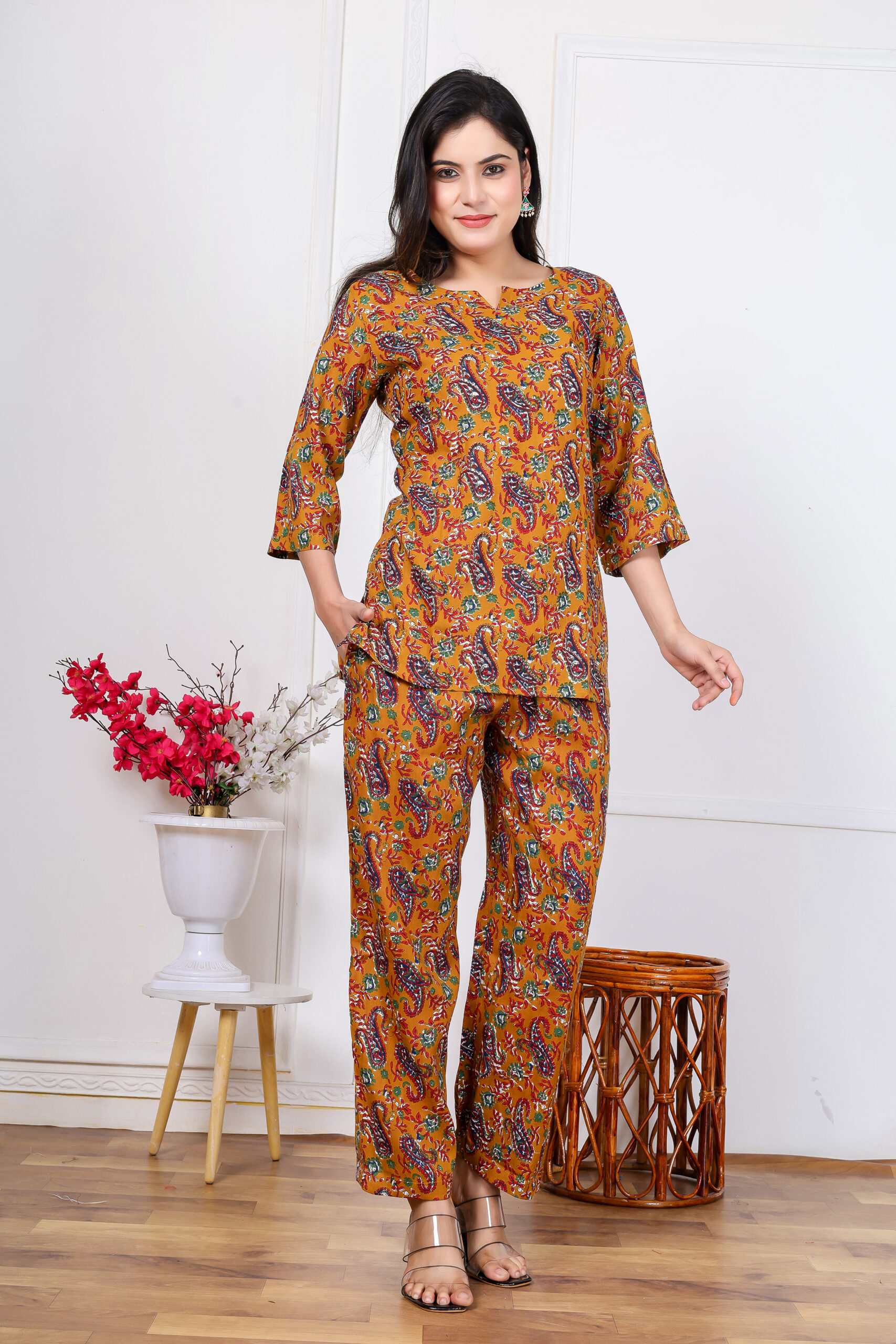 The warm mustard yellow base is beautifully highlighted with delicate, all-over prints, giving the outfit a chic yet traditional appeal. The 3/4 sleeve top offers a polished, modest silhouette, while the matching pant ensures relaxed movement and all-day breathability.