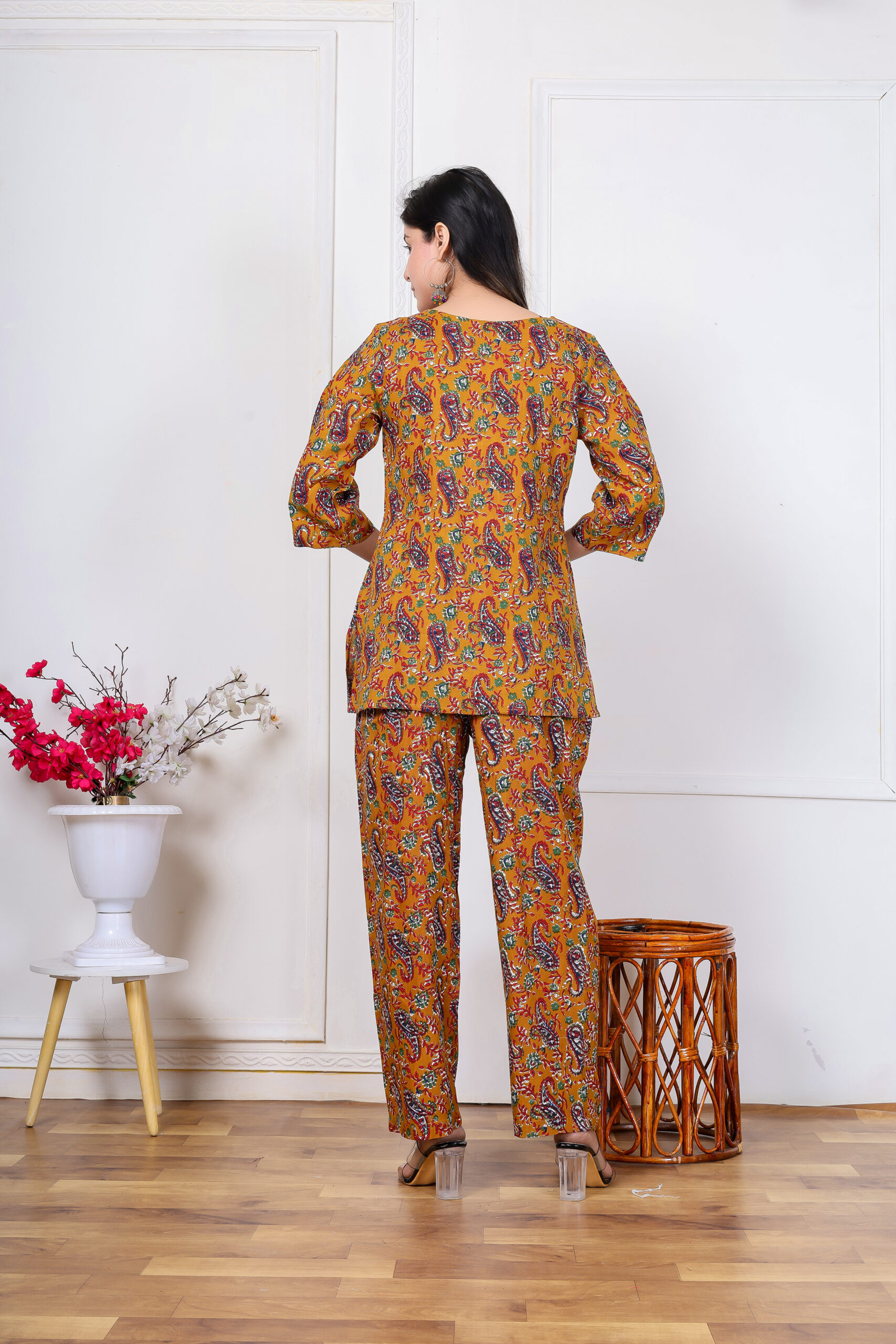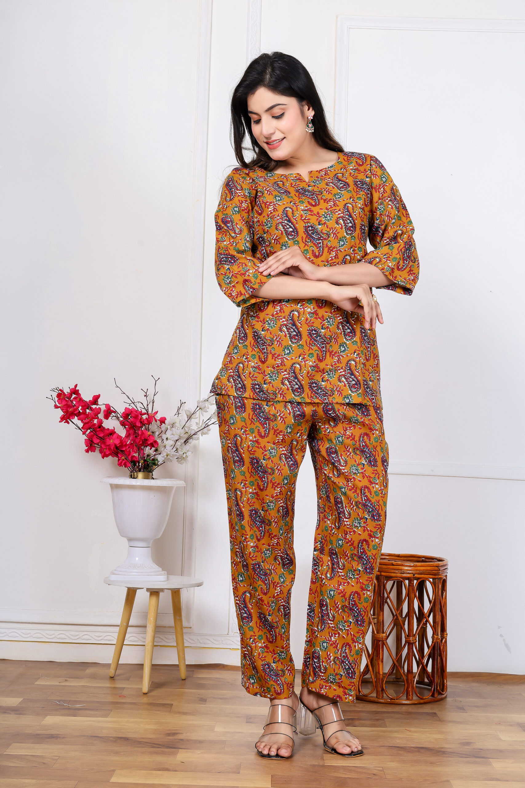 Ashvy Pure Cotton Printed Co-ord Set – Mustard Yellow Top & Pant for Everyday Comfort & Style