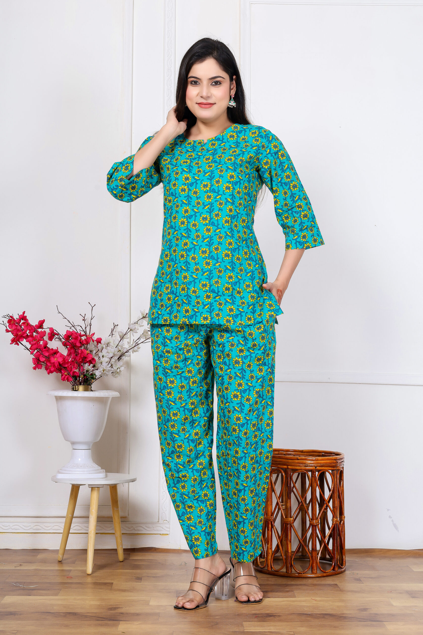 Soft and graceful Baby Pink Floral cotton co-ord set with a comfy 3/4 sleeve top and matching pant—perfect for office, outings, café dates, and daily wear.