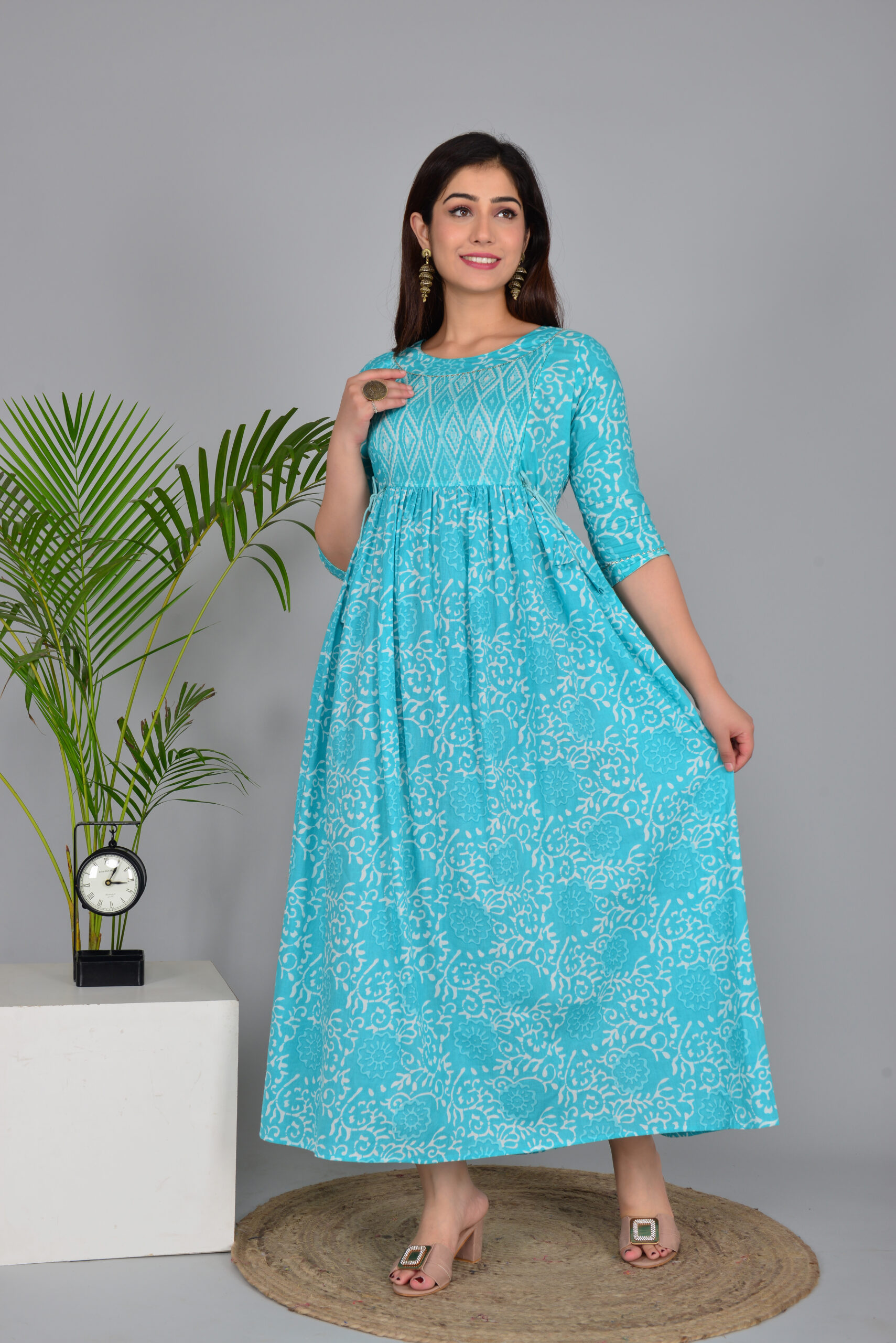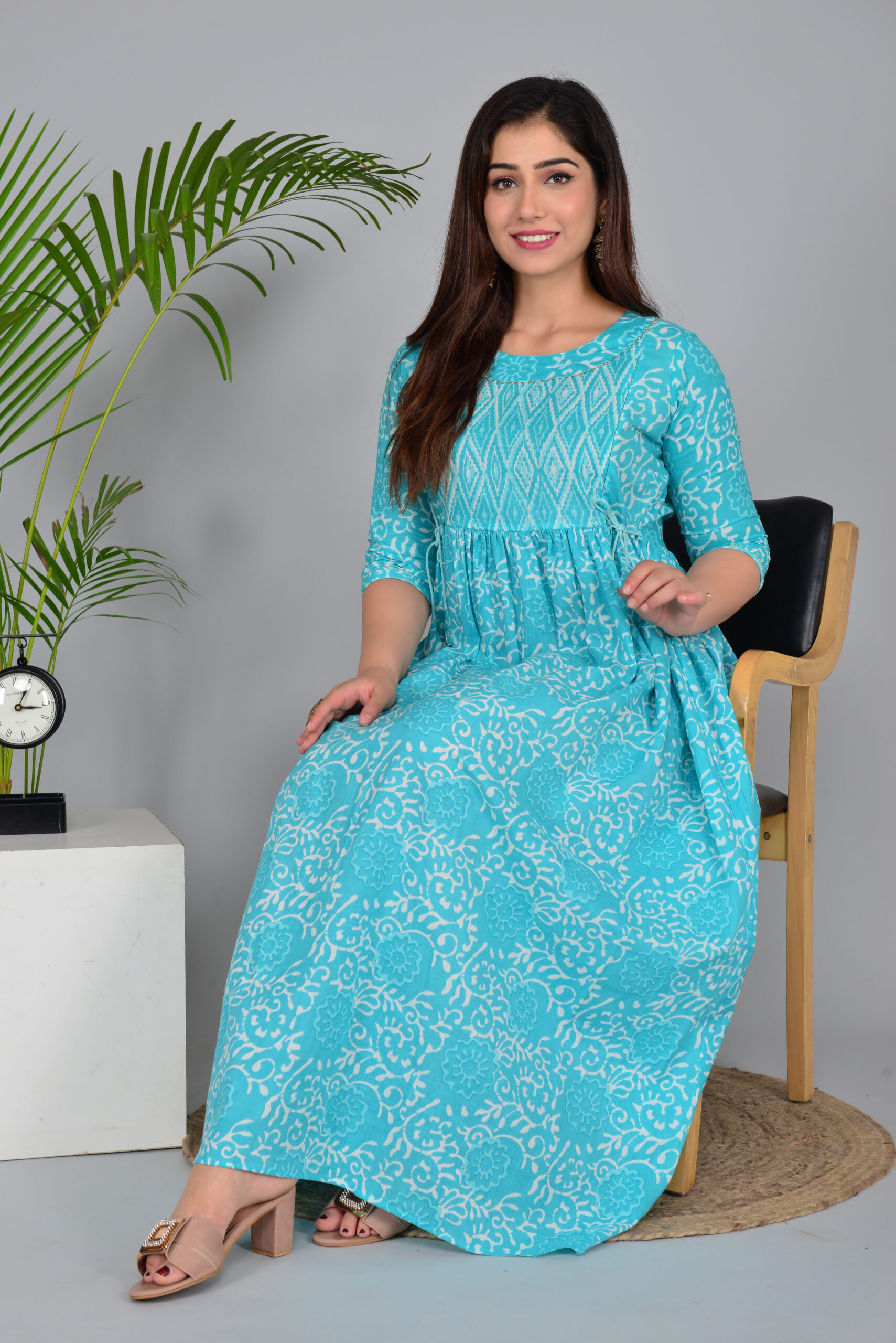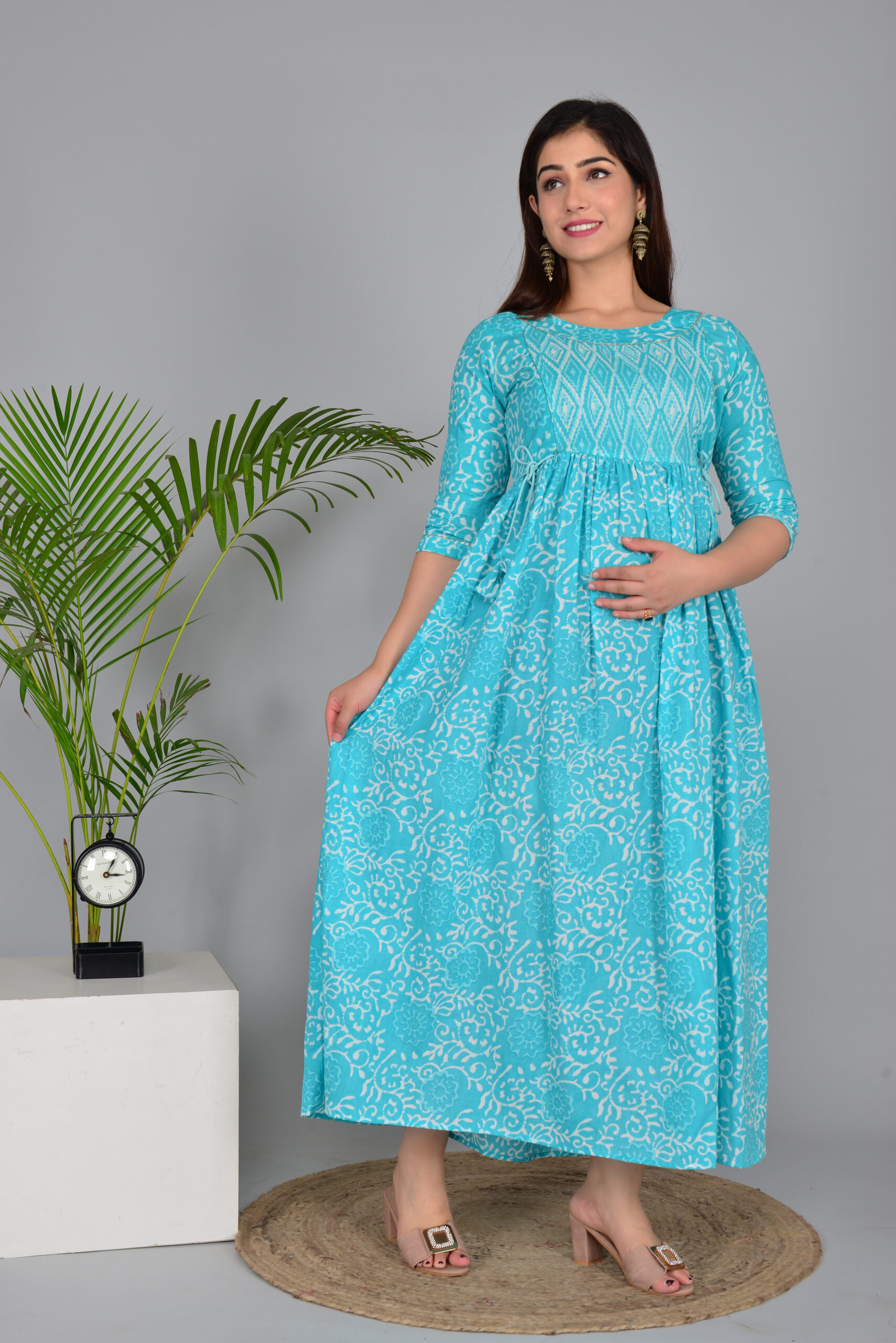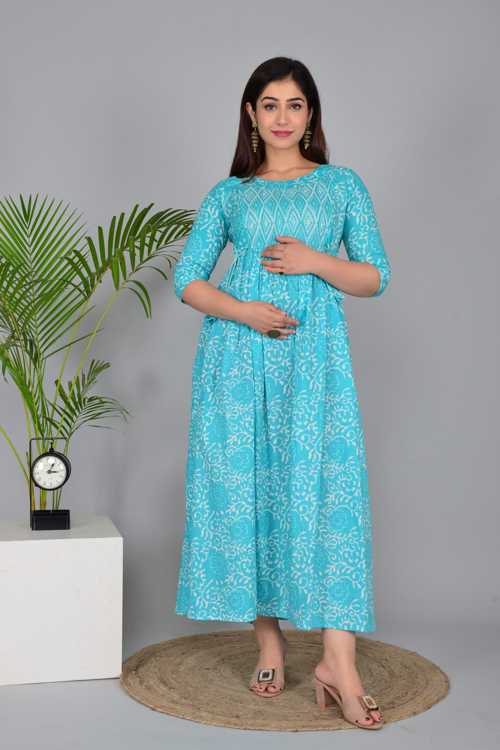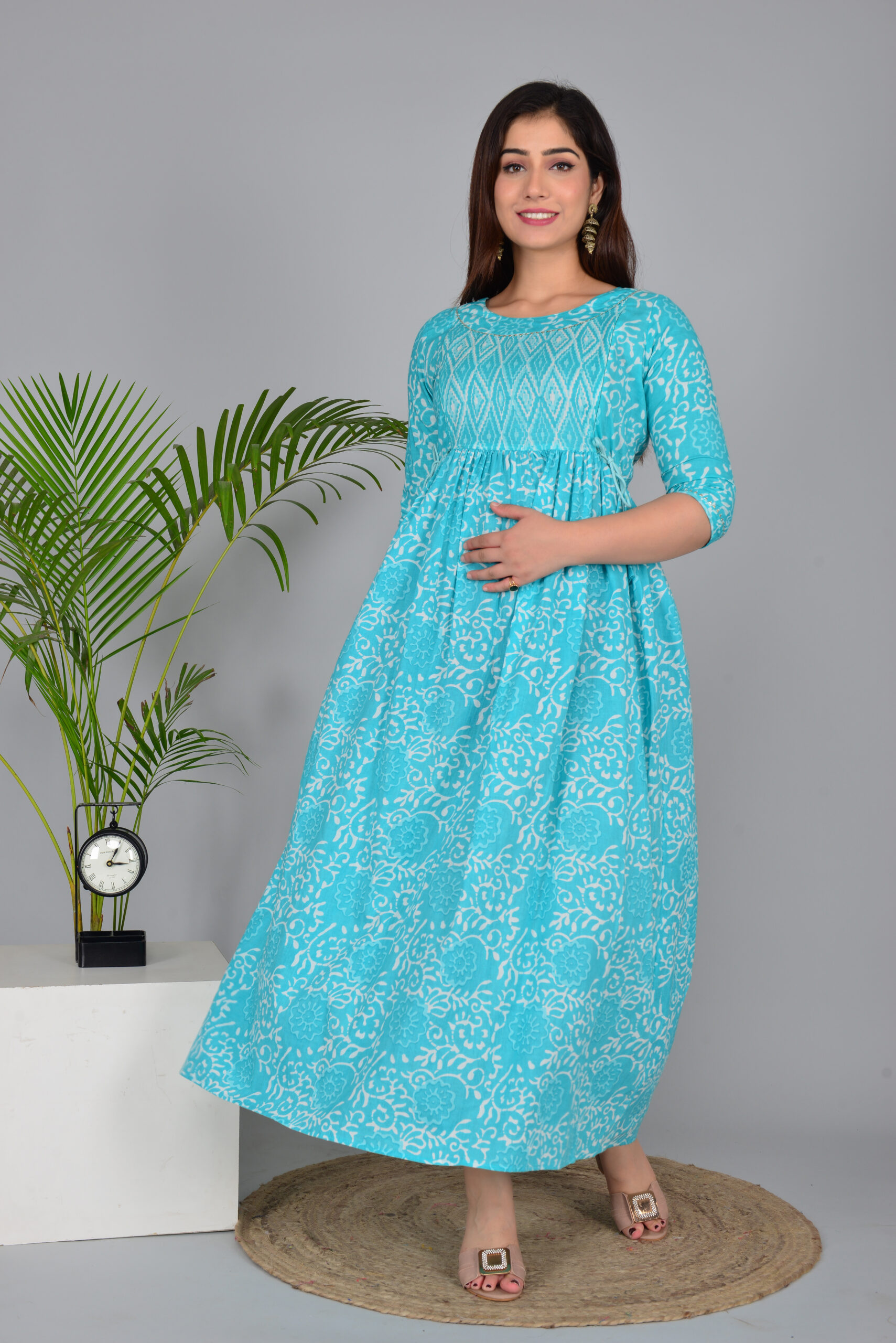 Cotton Maternity Gown — a simple, elegant Anarkali without belt or dori, featuring hidden zips for easy nursing.10 in stock