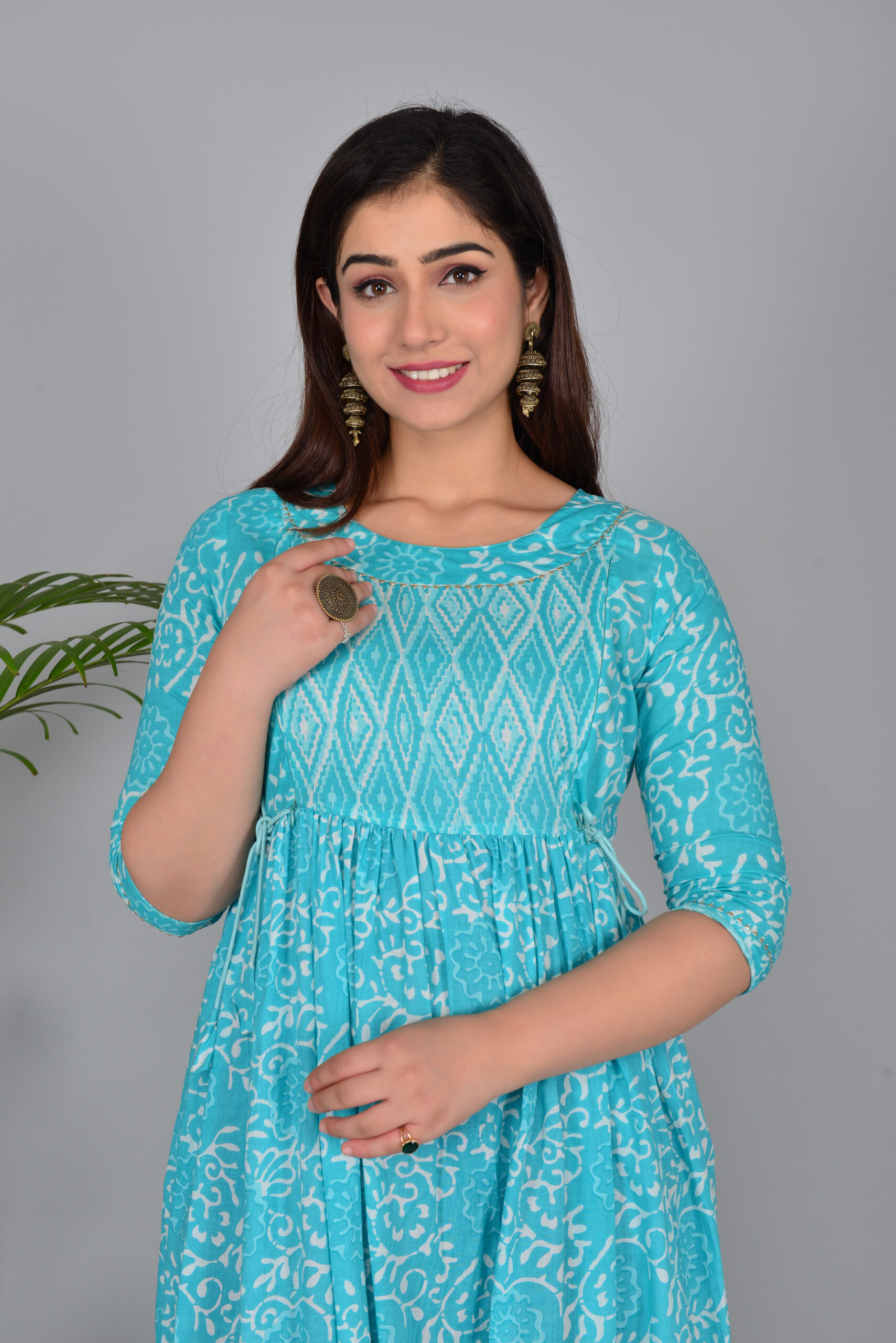 Feel light and elegant in Ashvy’s Sky Blue Bel Print Cotton Kurti — soft, breathable, and feeding-friendly with hidden zips for new and expecting moms.