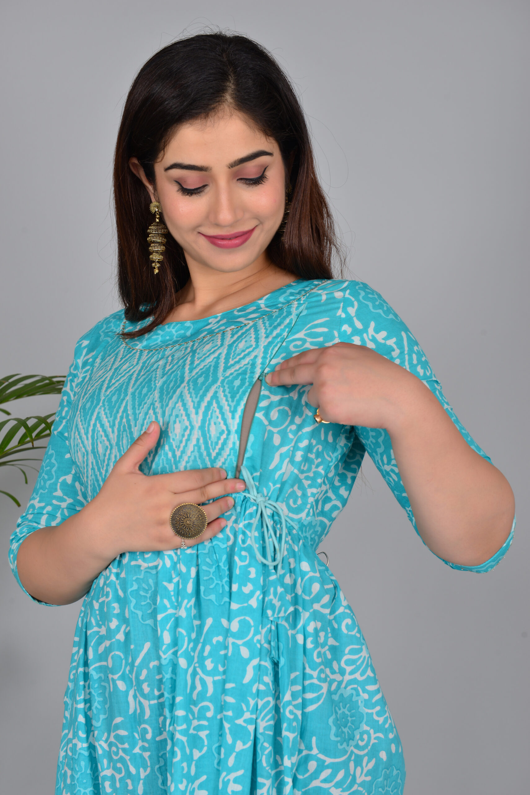 Ashvy Sky Blue Cotton Maternity Kurti – Soft, Feeding Friendly Nursing Wear for Moms