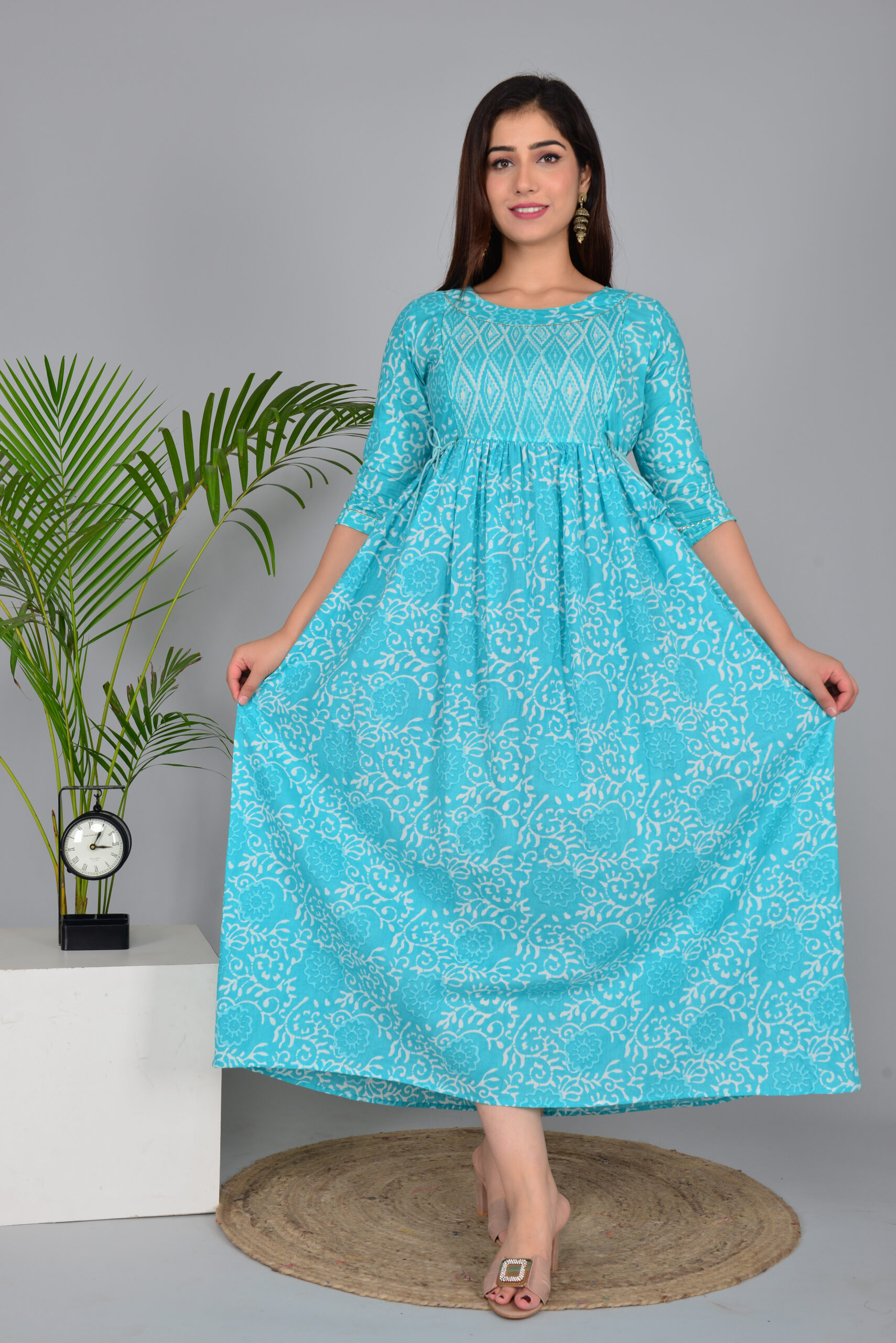 Stay stylish through motherhood with Ashvy’s Blue Gold Rayon Cotton Kurti — soft, breathable, nursing-friendly design for pregnancy and beyond.