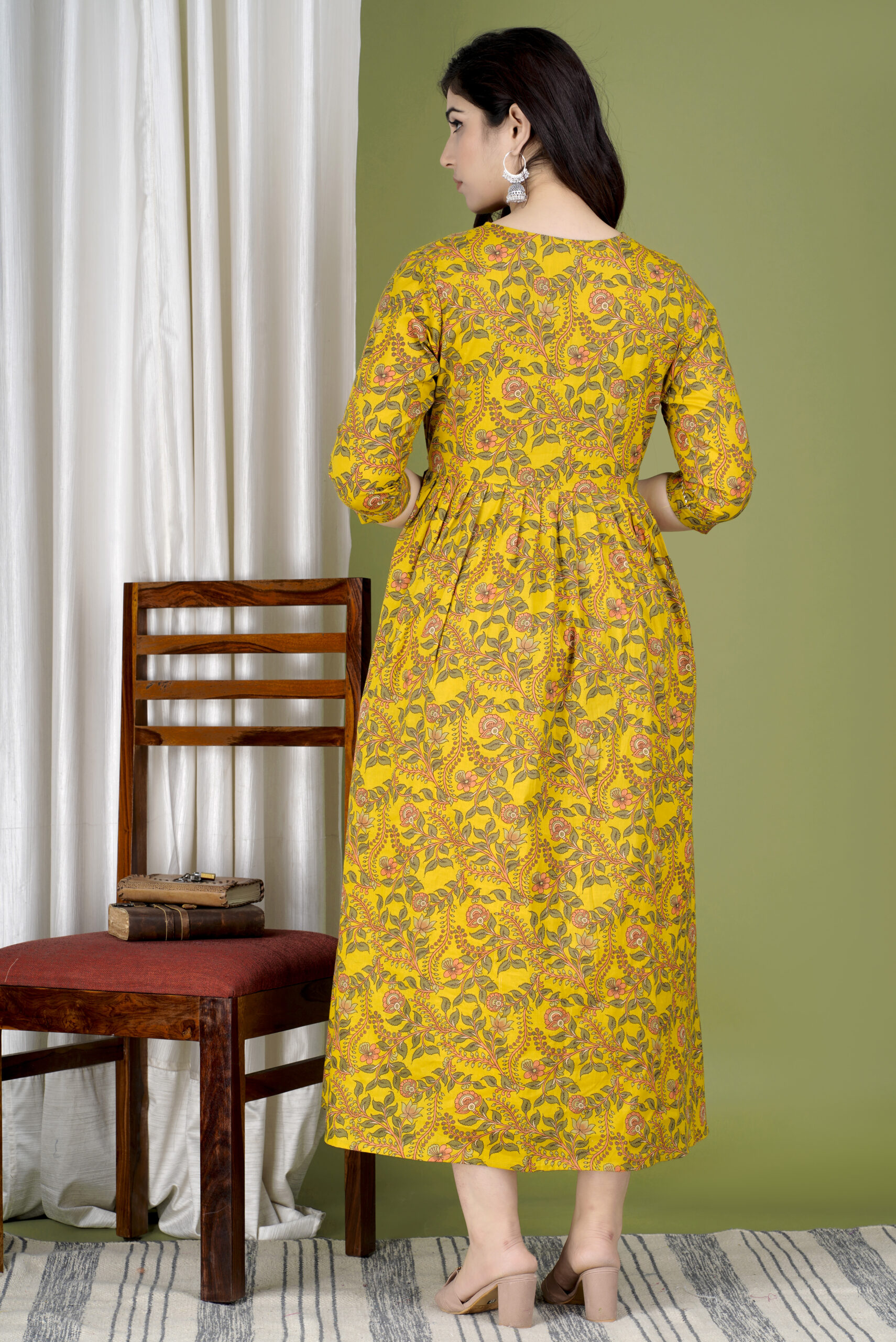 Discreet front nursing access makes feeding simple and private, while the intricate yoke design adds a unique touch to the vibrant yellow base with floral patterns. This dress is perfect for home lounging, baby showers, temple visits, or casual outings. The 3/4 sleeves and maxi length offer modest yet stylish coverage.