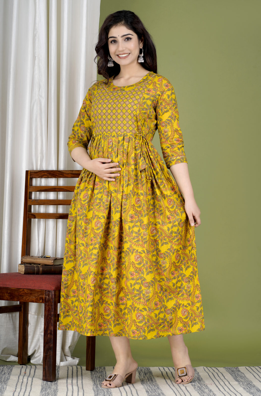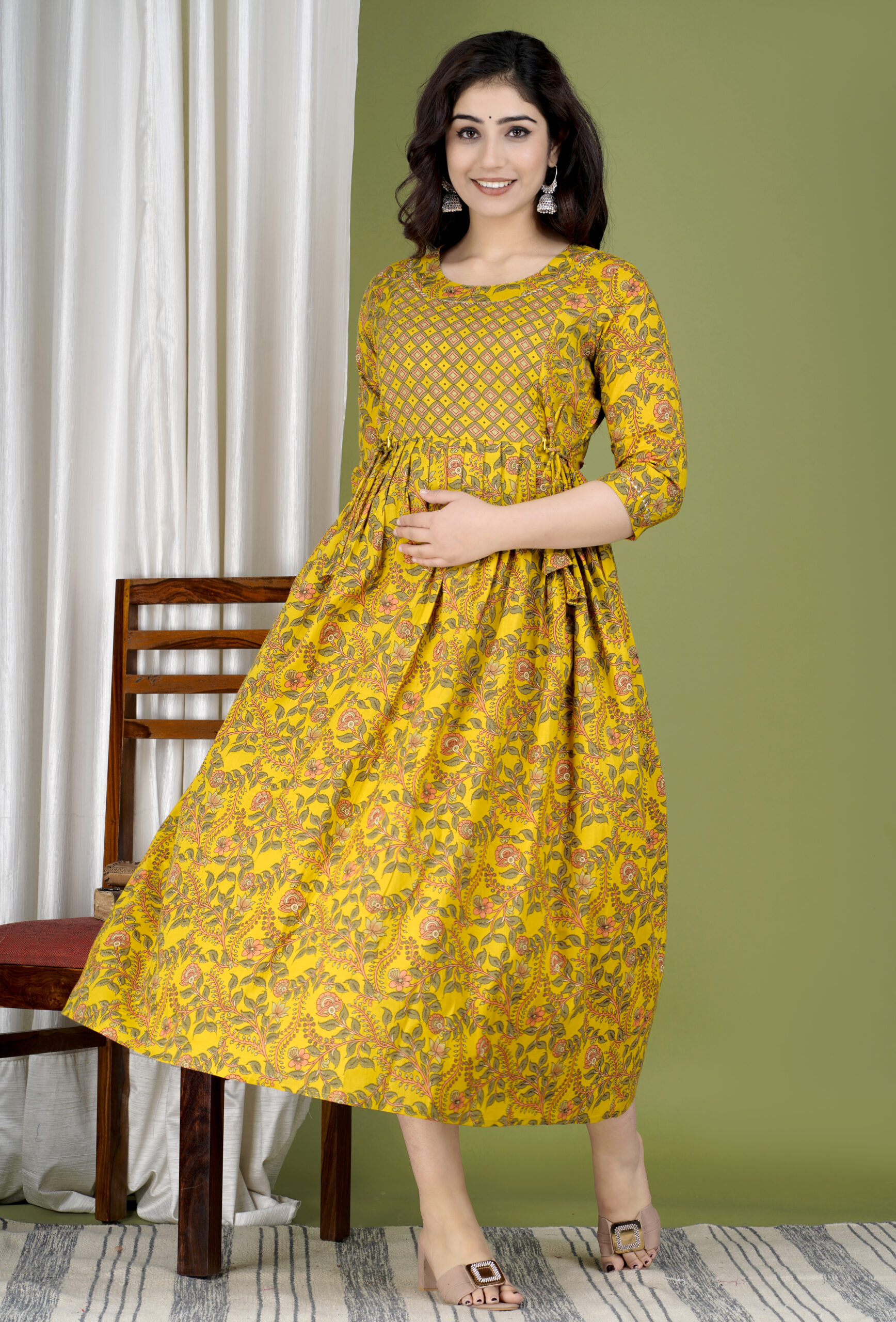 Ashvy India Golden Yellow Floral Cotton Maternity Maxi Dress – 2030