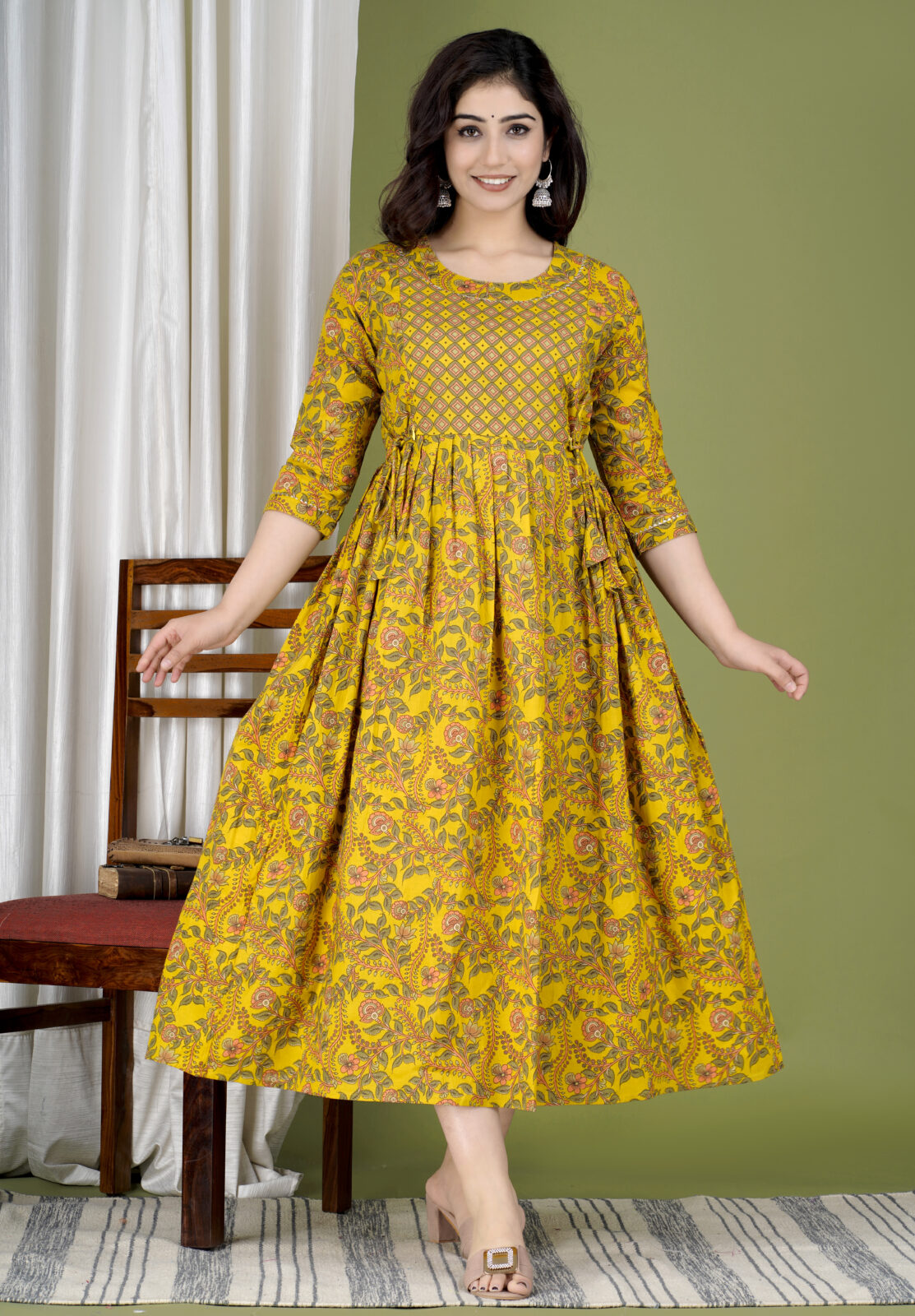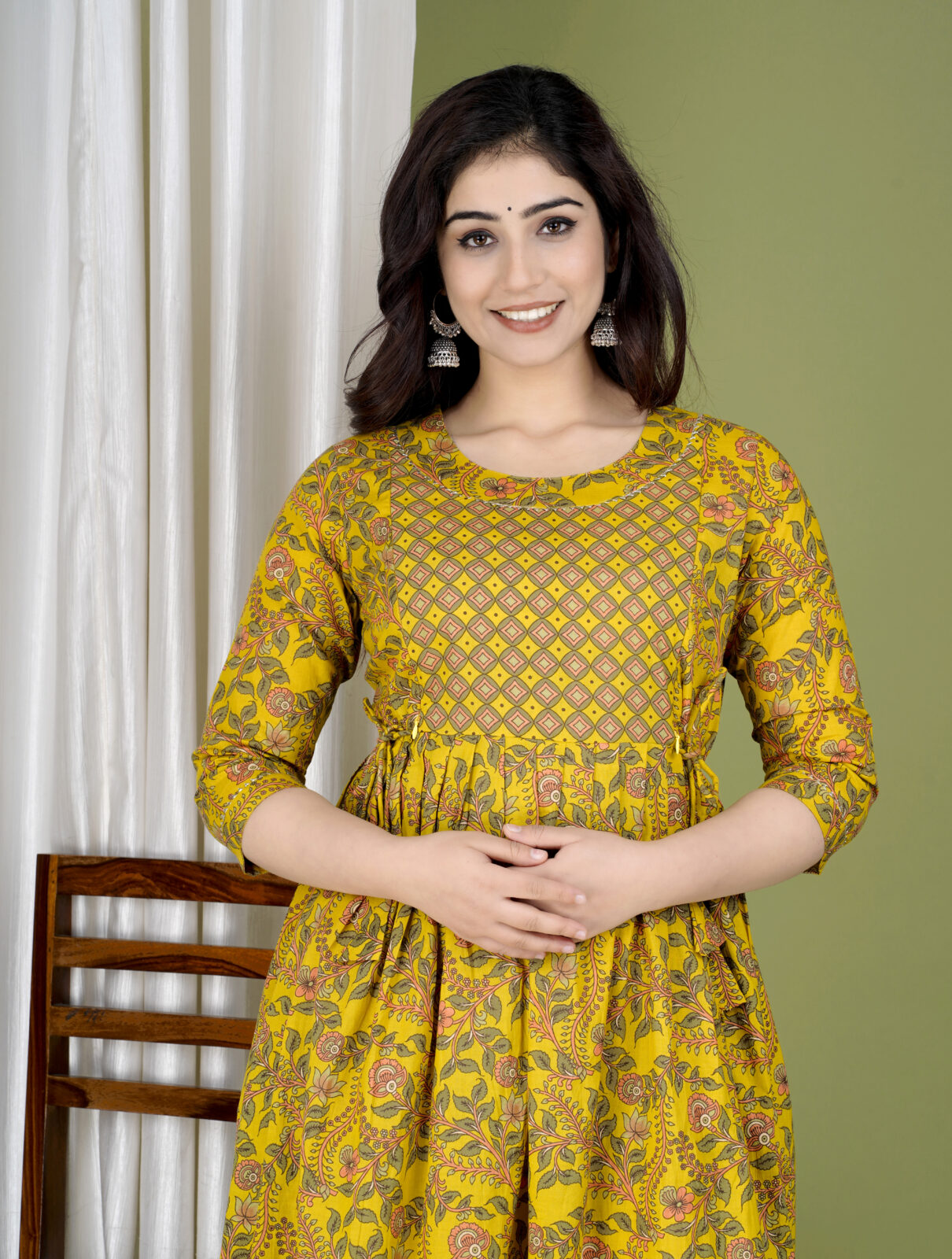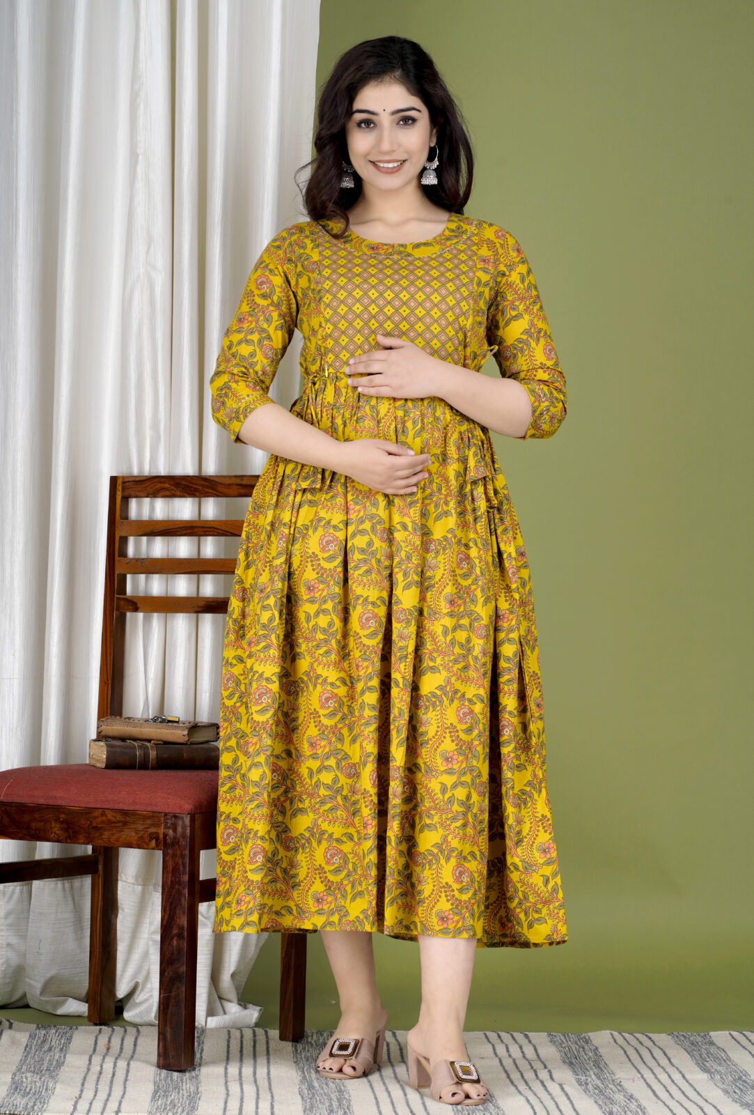 Stay stylish in Ashvy’s Rama Green Cotton Maternity Kurti — elegant Anarkali fit with soft yellow floral prints and hidden zips for easy feeding comfort.