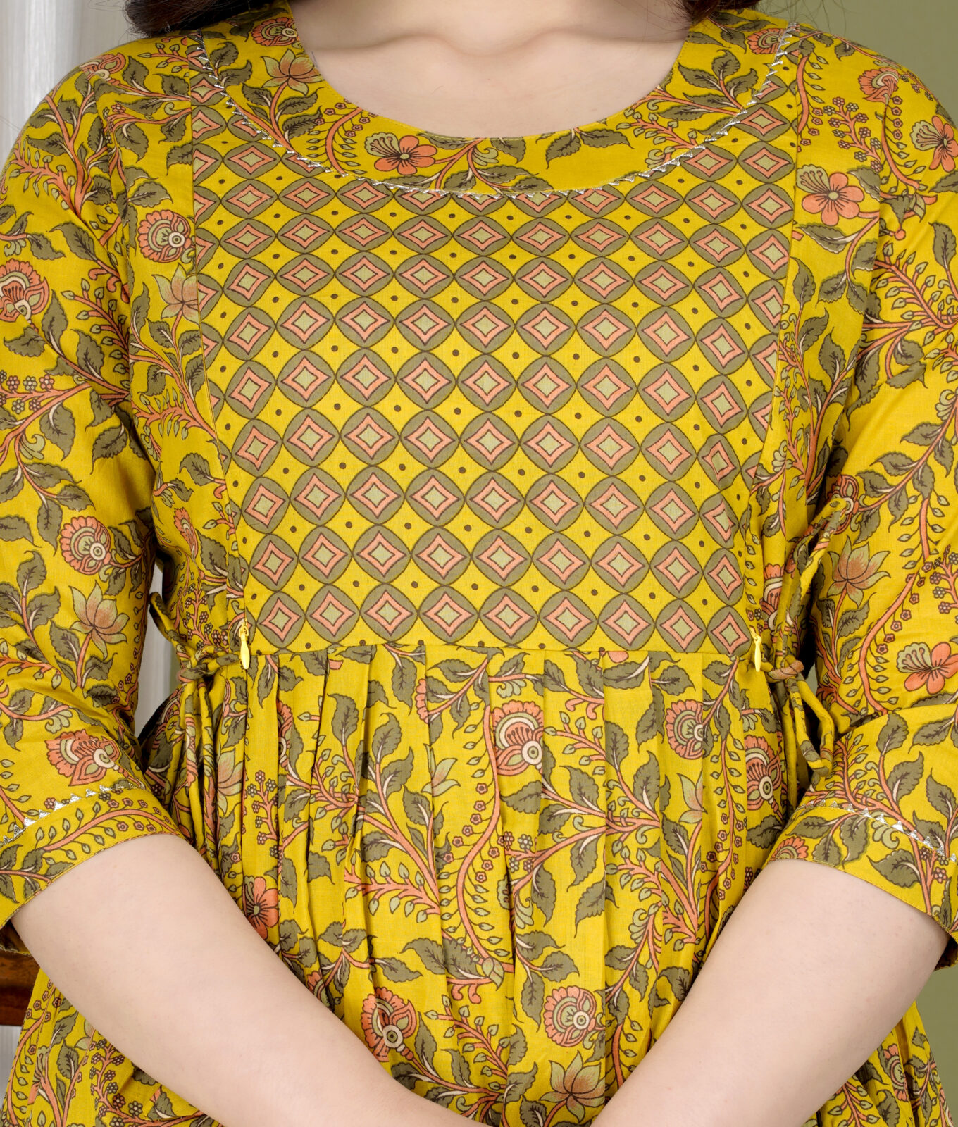 Add freshness to your maternity style with Ashvy’s Pista Green Cotton Kurti — soft yog design, yellow floral print, and hidden zips for easy nursing comfort.