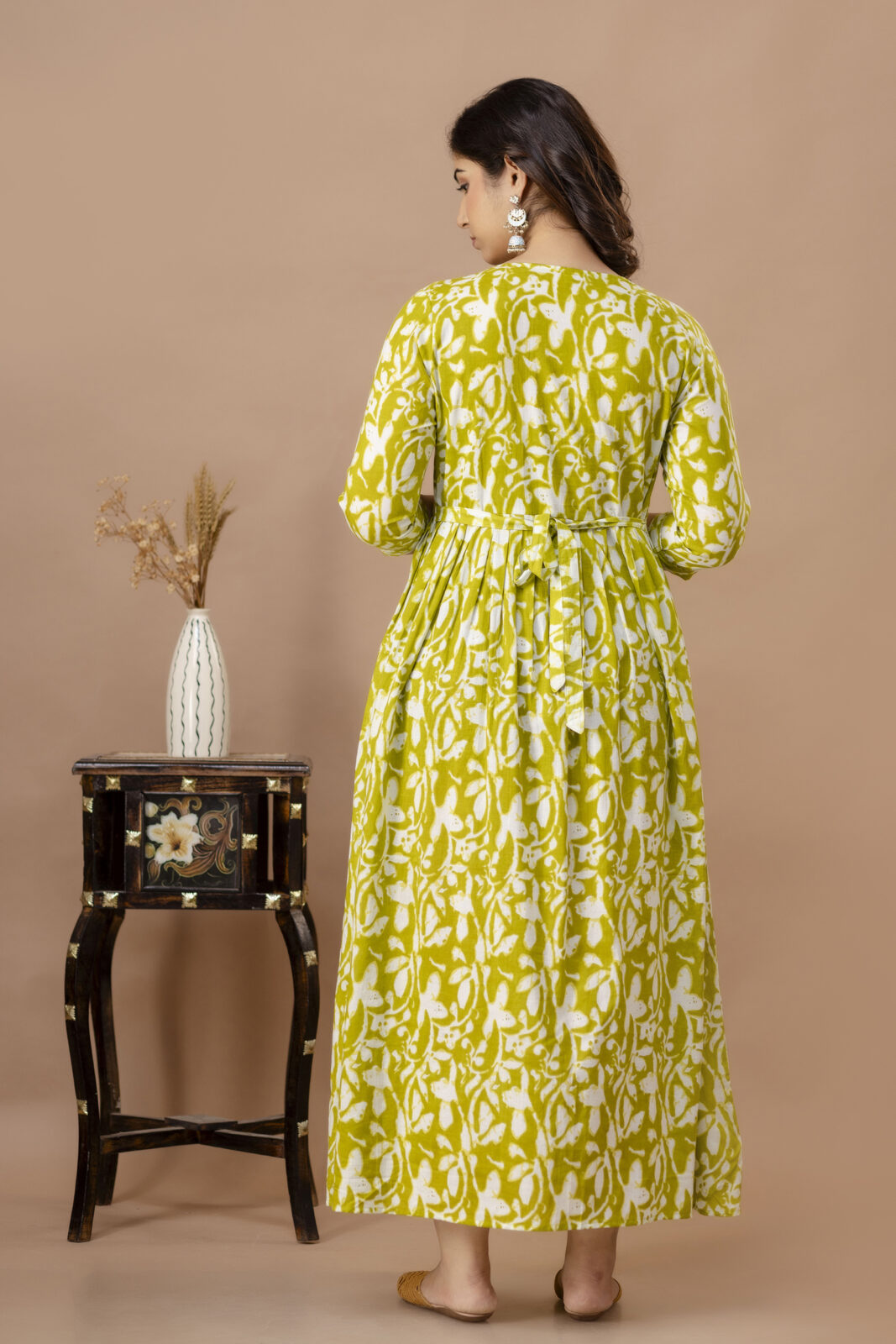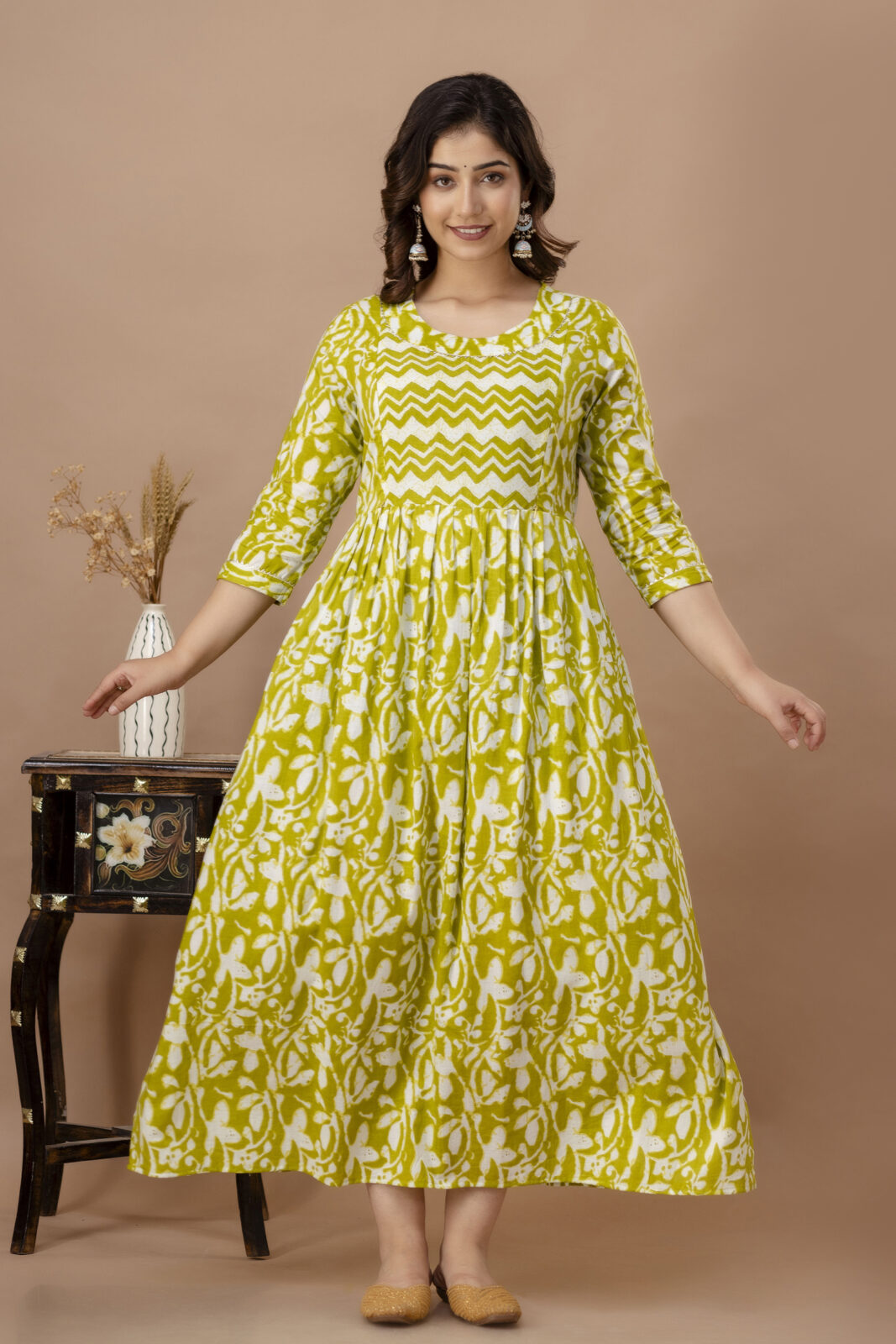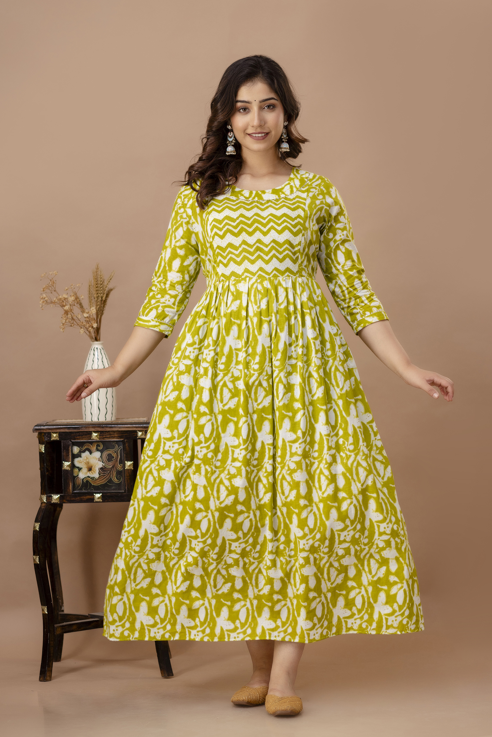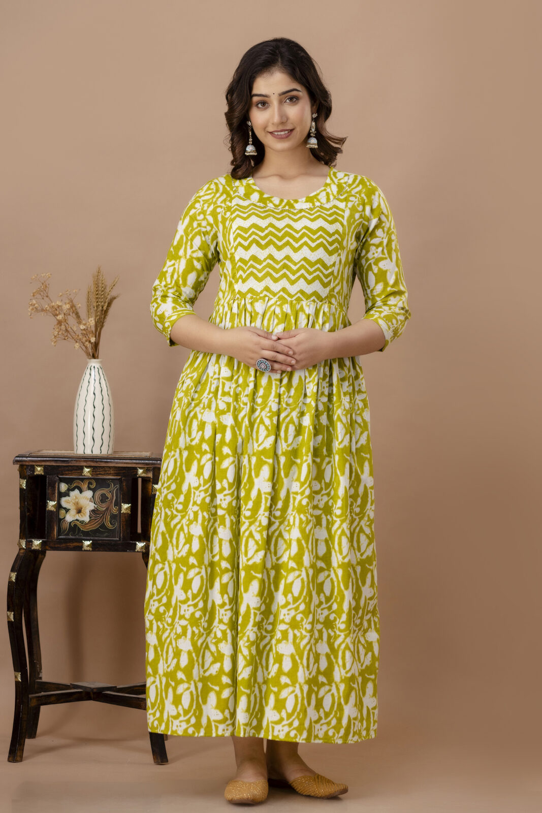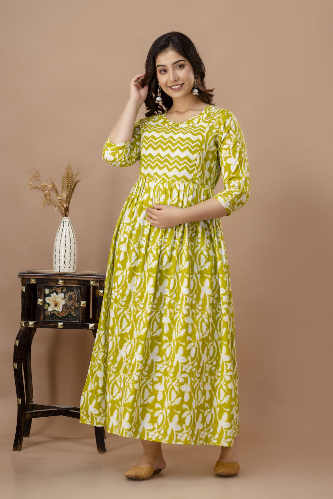 Brighten your maternity look with Ashvy’s Light Green Floral Cotton Kurti — elegant Anarkali design with dori tie, soft cotton fabric, and hidden zips for easy feeding.