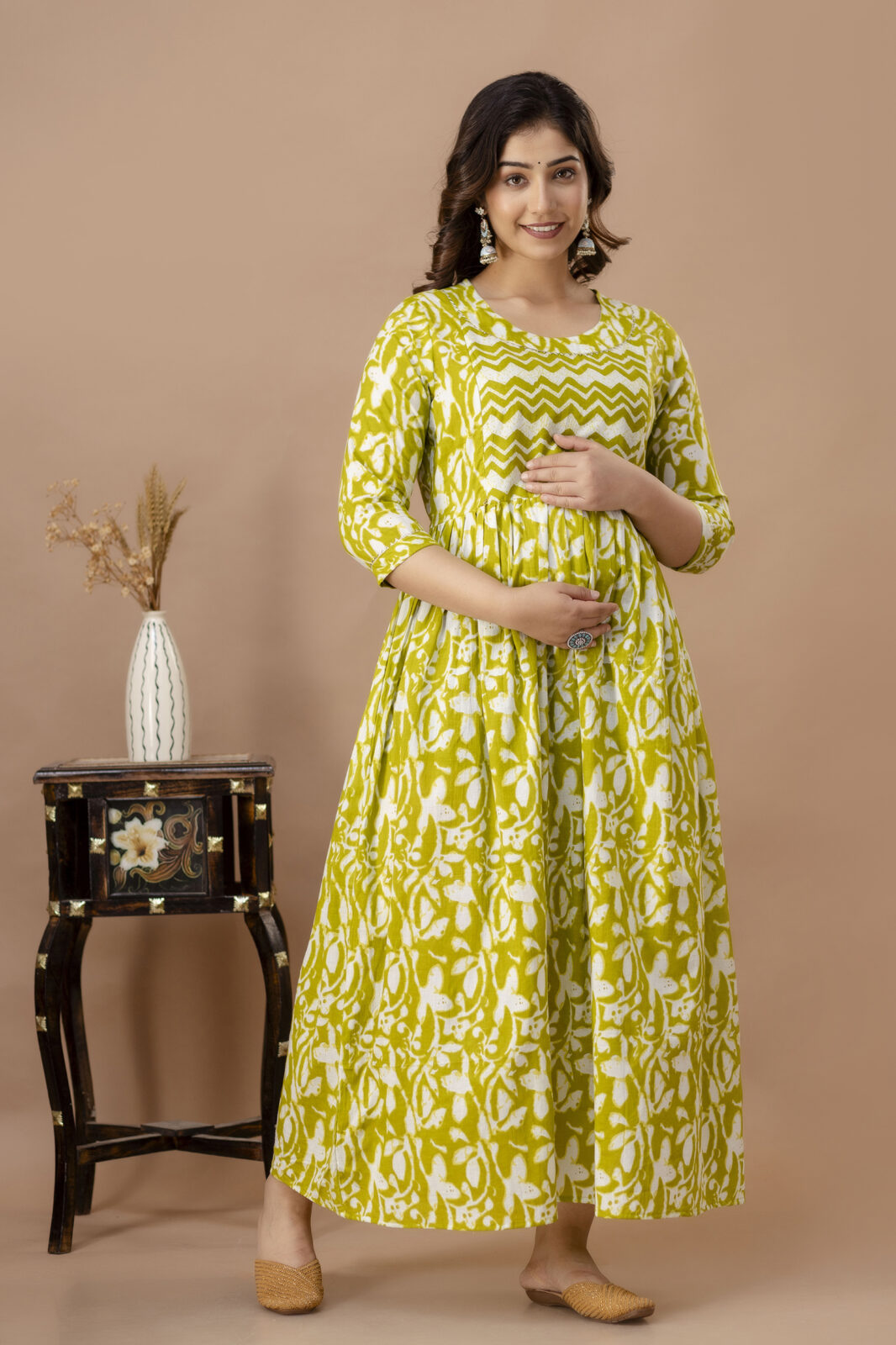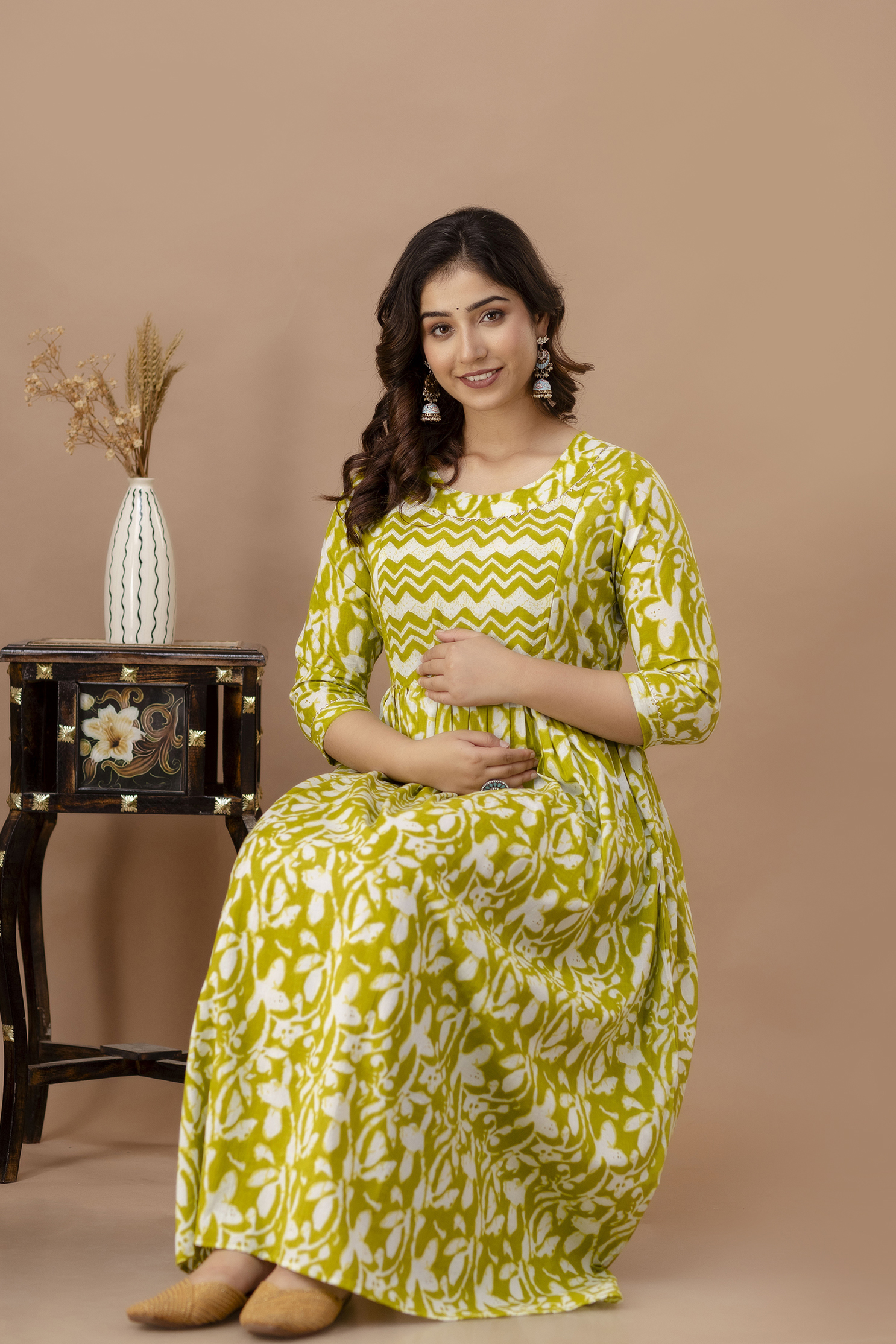 Add freshness to your maternity style with Ashvy’s Pista Green Cotton Kurti — soft yog design, yellow floral print, and hidden zips for easy nursing comfort.