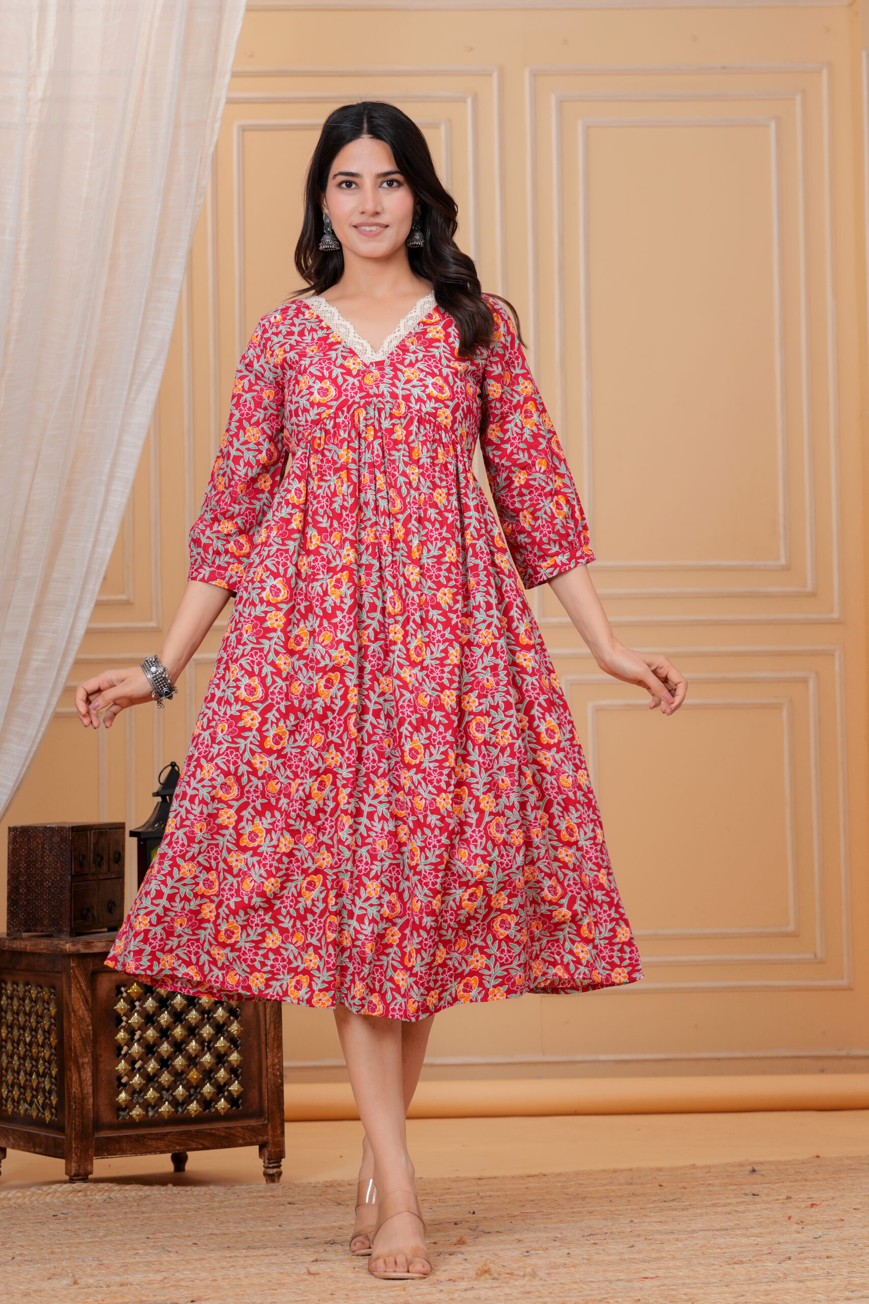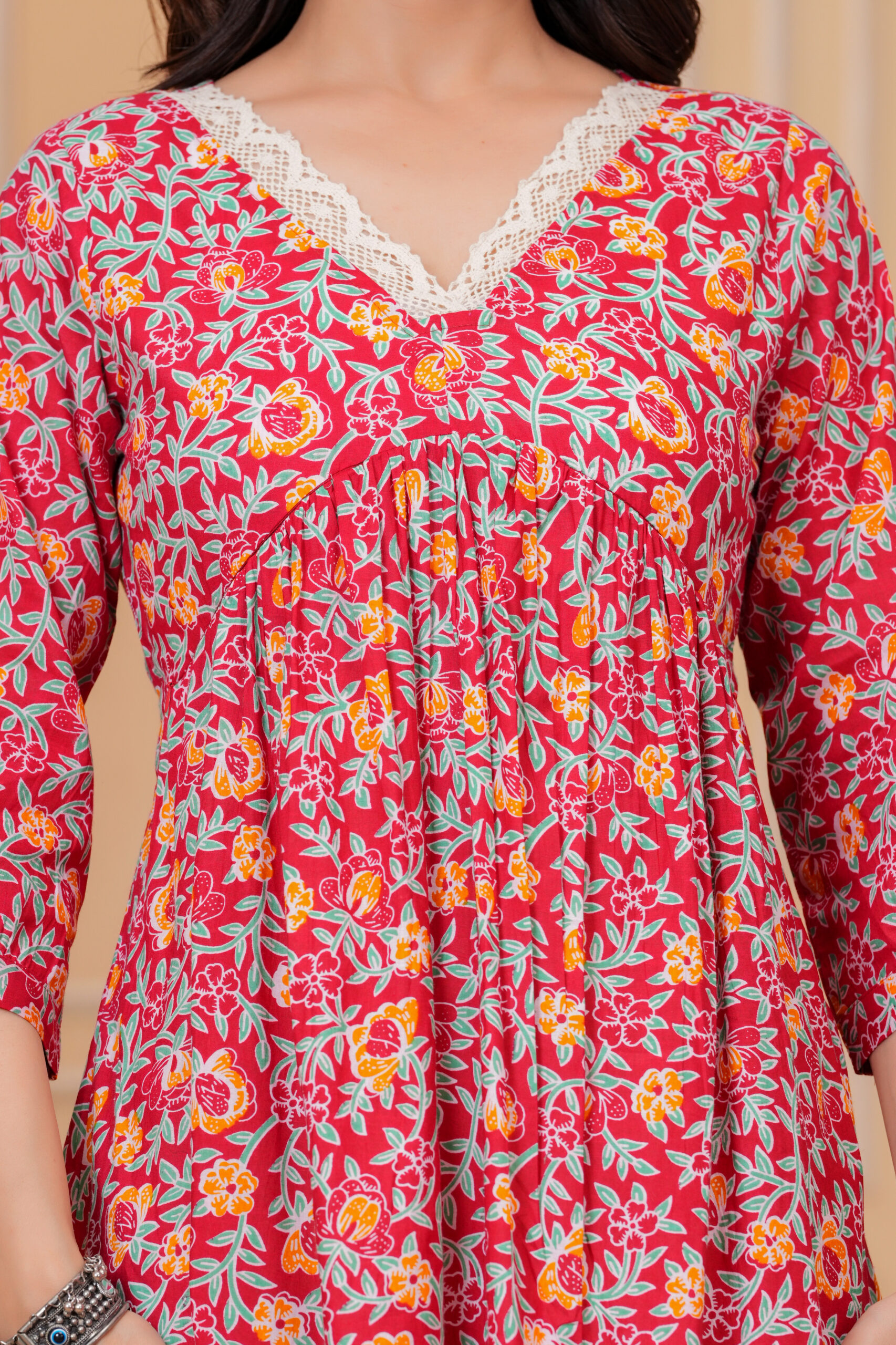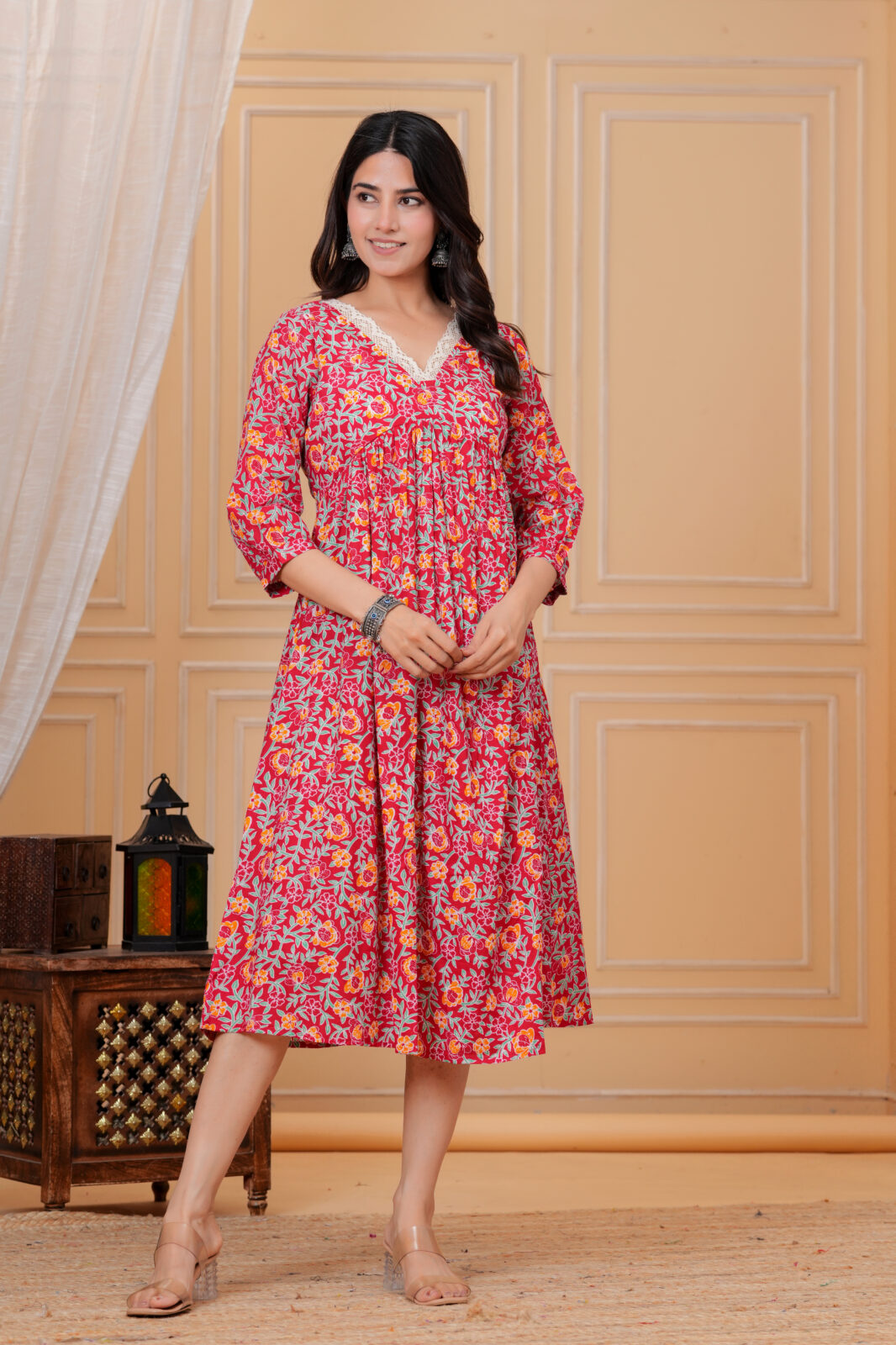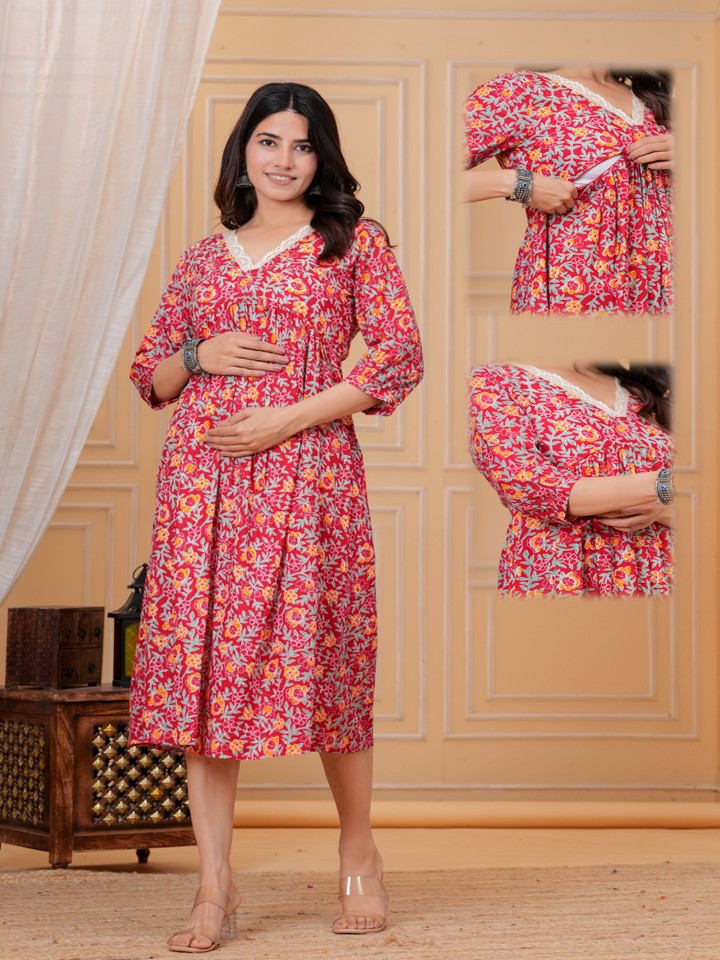 Discreet front nursing access ensures quick, private feeding, enhanced by a simple V‑neck design. The mix of pinks, reds, and greens in floral prints brings a lively, happy vibe for home, outings, or baby events. 3/4 sleeves and midi length keep it practical and modest.