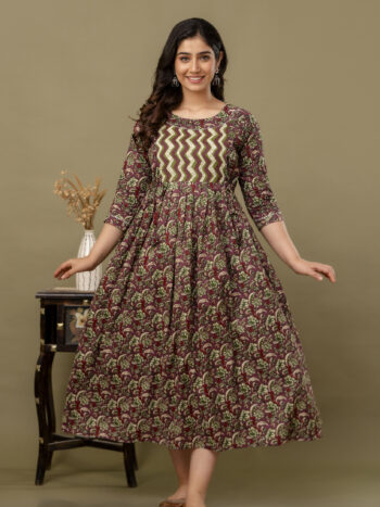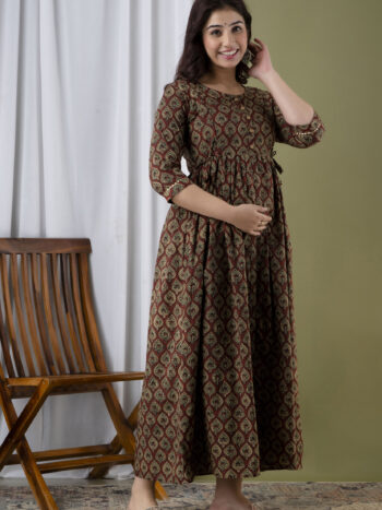 Sale 100%Ashvy Brown Cotton Maternity Kurti – Pan Patti Print Feeding & Nursing Wear for Moms