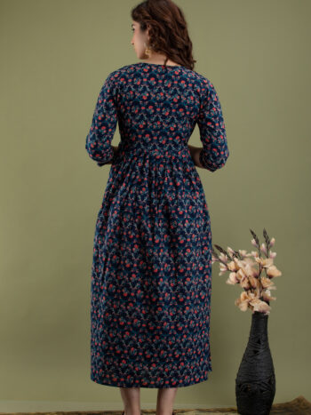 Sale 100%Ashvy Dark Blue Floral Maternity Kurti – Cambric Cotton Feeding Gown with Side Dori